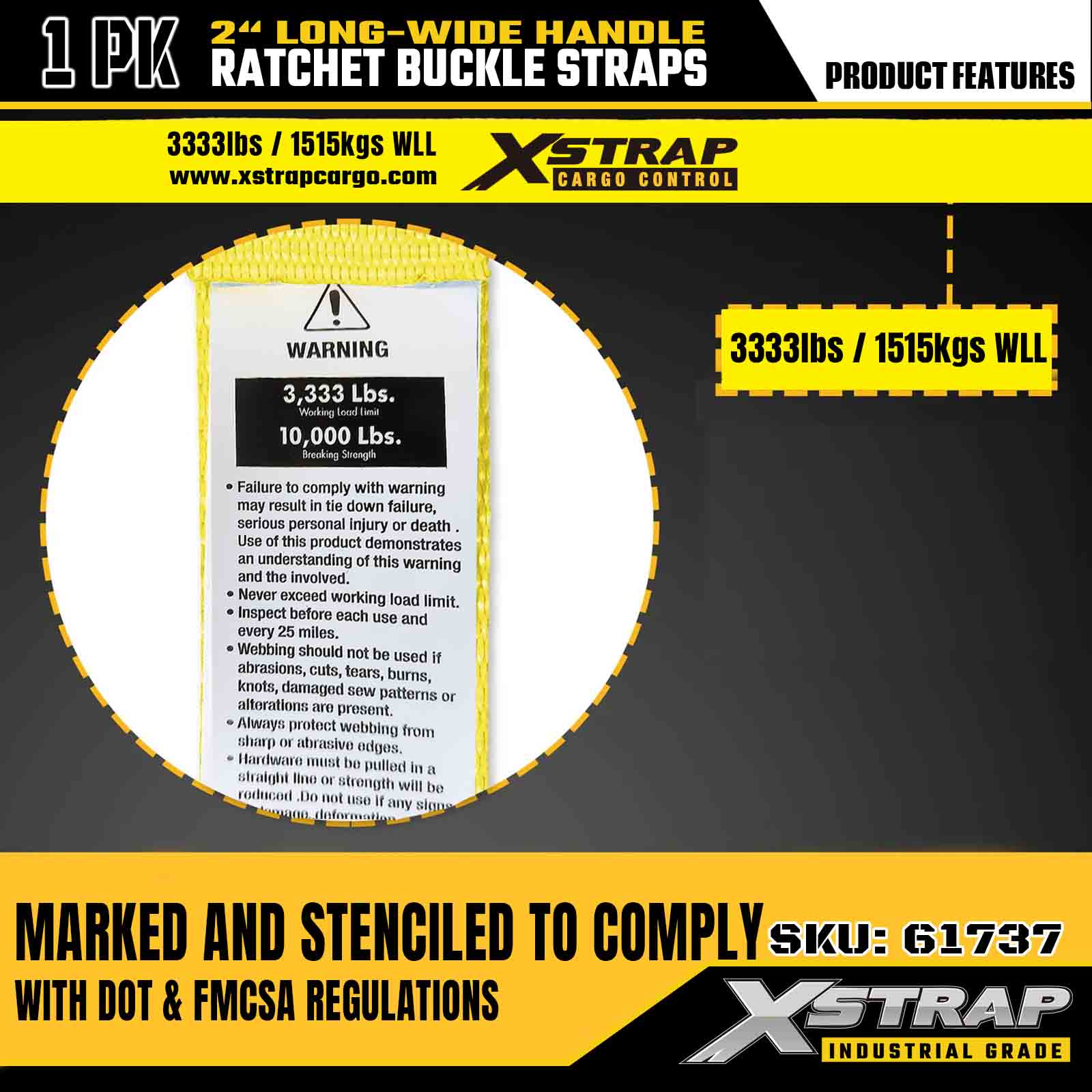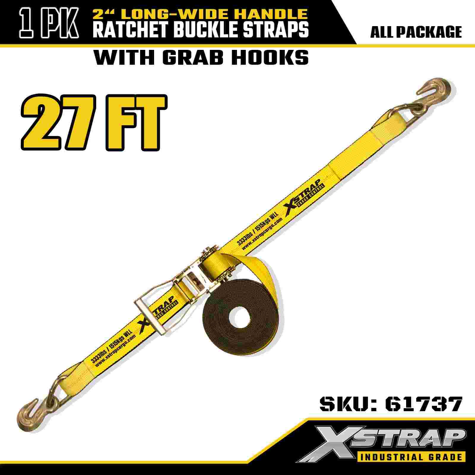 Xstrap 61737 Heavy Duty 2" x 27' 1PK র্যাচেট স্ট্র্যাপ উইথ গ্র্যাব হুকস ইয়েলো, WLL 3,333 পাউন্ড, যন্ত্রপাতি ও সরঞ্জামের জন্য লম্বা চওড়া হ্যান্ডেল র্যাচেট টাই ডাউন স্ট্র্যাপ