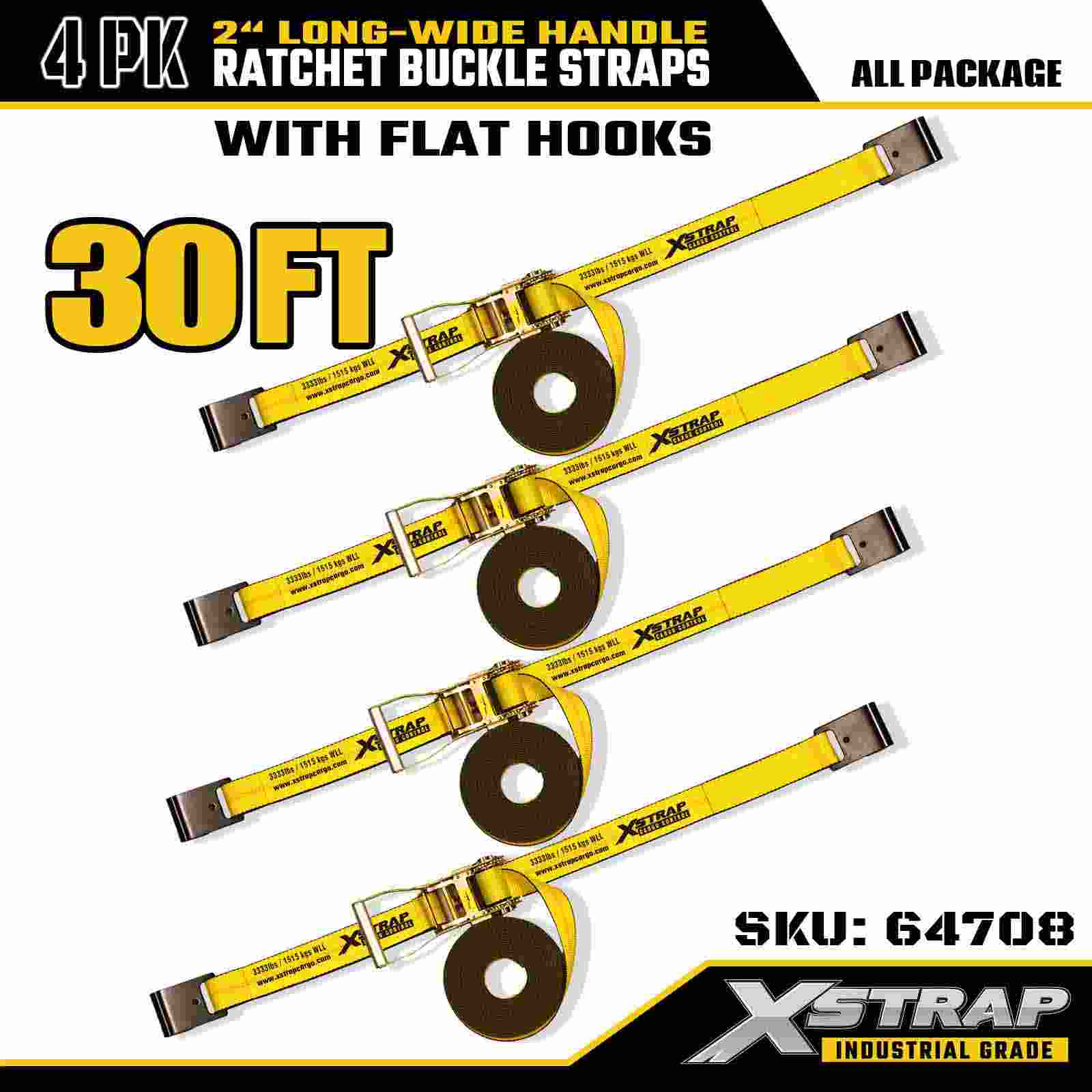 Xstrap 64708 2" x 30ft এক্সটেন্ডেড হ্যান্ডেল র্যাচেট বাকল স্ট্র্যাপস (4-প্যাক) - ফ্ল্যাট হুক, 10,000 পাউন্ড রেটেড স্ট্রেন্থ, ইন্ডাস্ট্রিয়াল কার্গো কন্ট্রোল সলিউশন