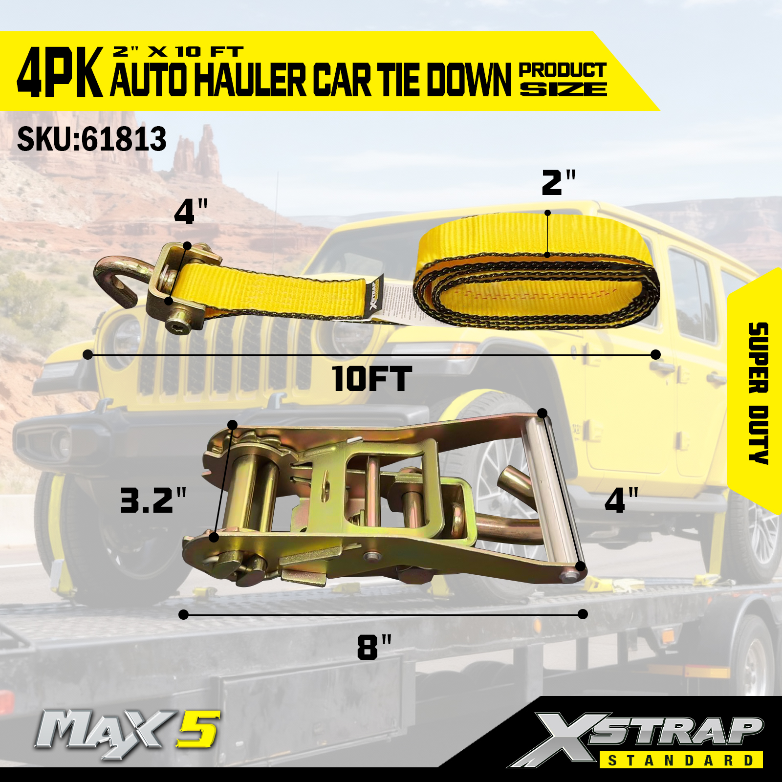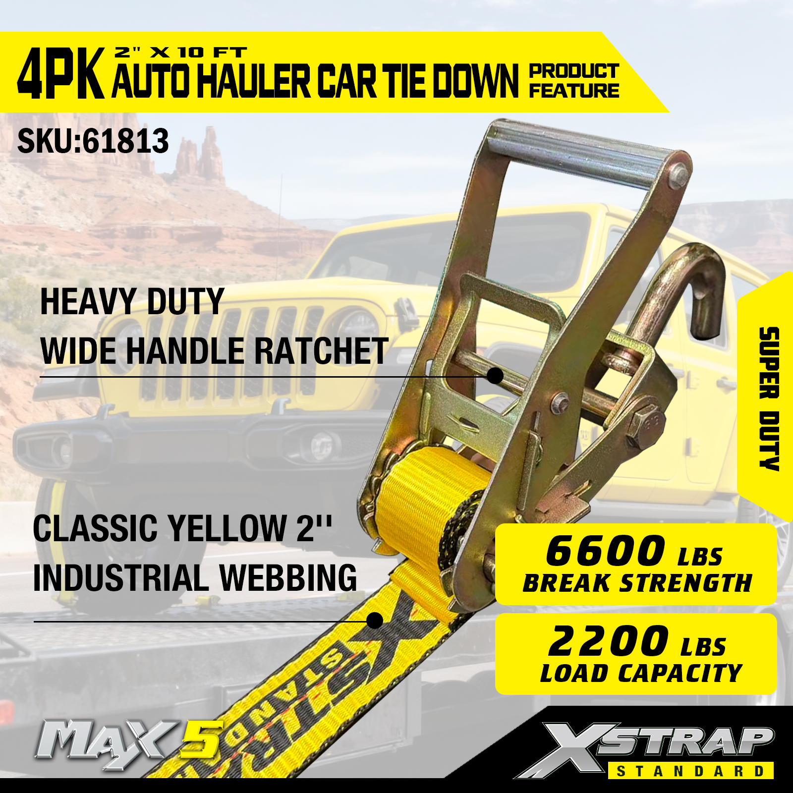 - হেভি-ডিউটি ওয়াইড-হ্যান্ডেল র্যাচেট: ওয়াইড-হ্যান্ডেল র্যাচেট ডিজাইনটি সহজ টেনশনের জন্য অতিরিক্ত লিভারেজ প্রদান করে, এমনকি বড় যানবাহন সুরক্ষিত করার সময়ও হাতের ক্লান্তি কমায়।