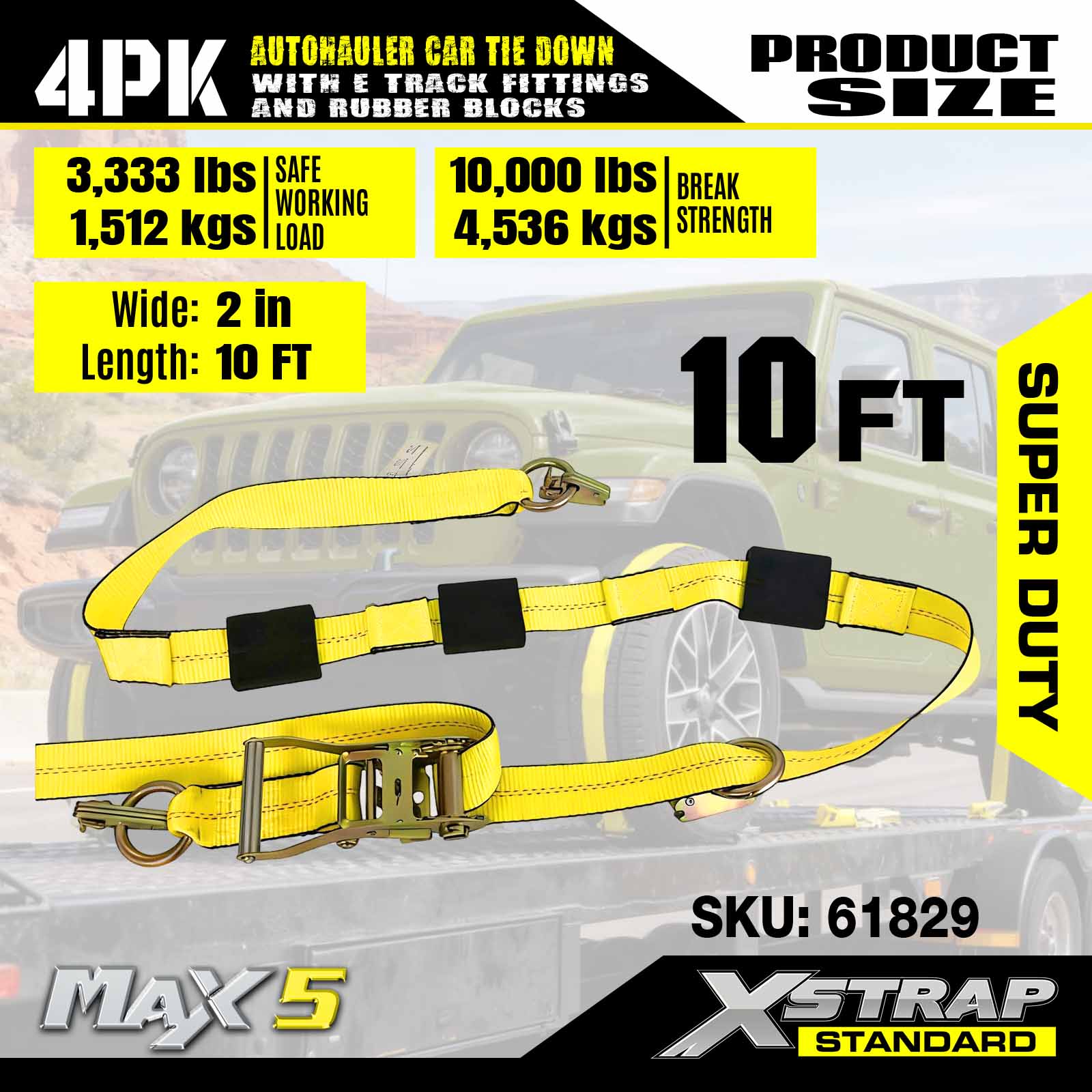 ট্রেলারের জন্য এক্সস্ট্র্যাপ ই ট্র্যাক টায়ার স্ট্র্যাপস হেভি ডিউটি 2" x 10' অটো হোলার স্ট্র্যাপ-10,000lb গ্যারান্টিড ব্রেক স্ট্রেংথ-(4) ট্রাকের জন্য রাবার ব্লক হুইল টাই-ডাউনের সাথে প্রিমিয়াম ভেহিকেল টাই ডাউন কিট, UTV