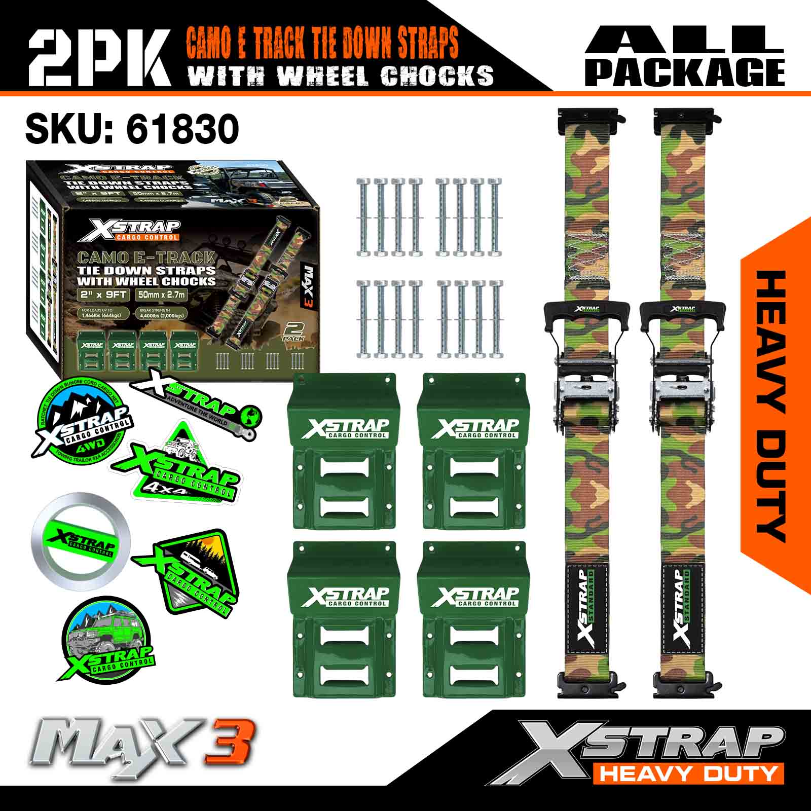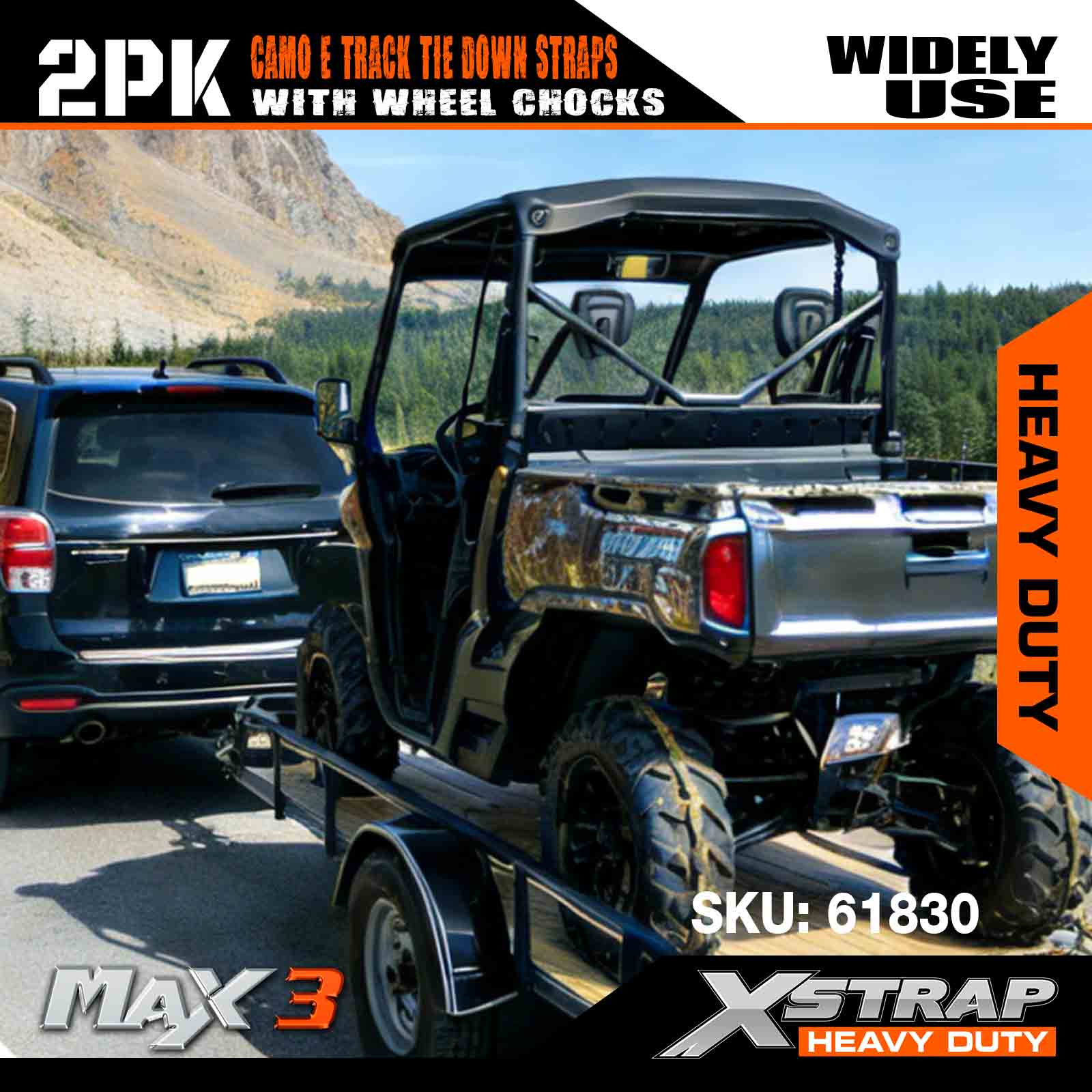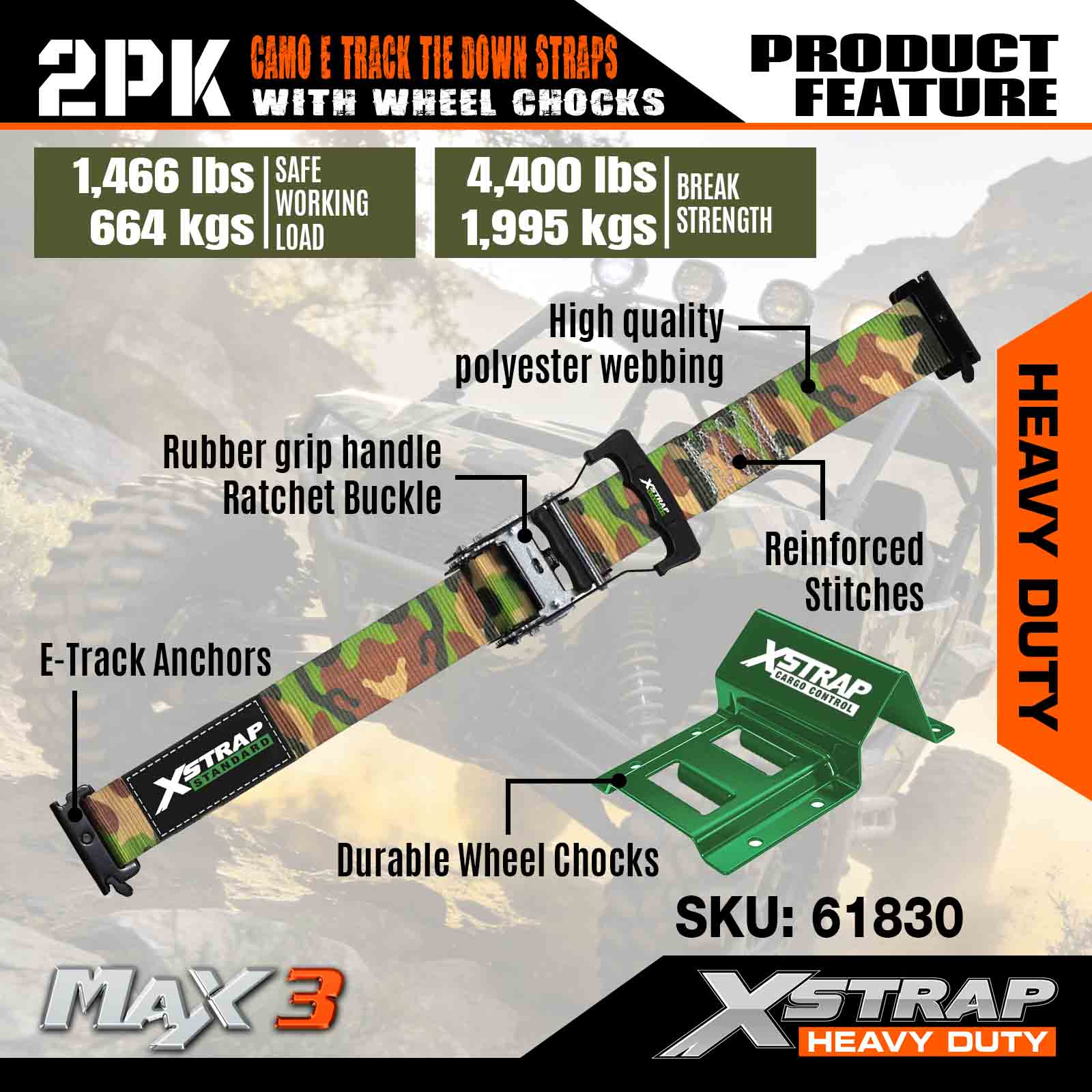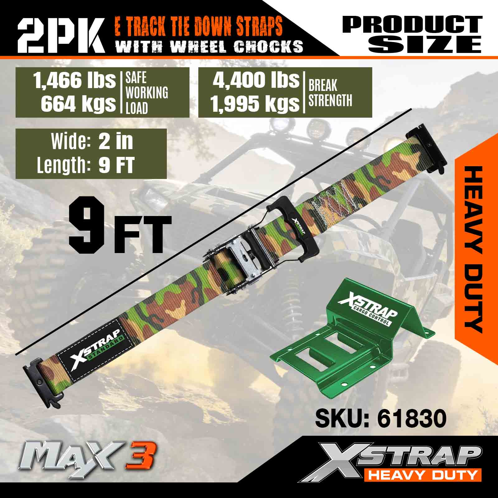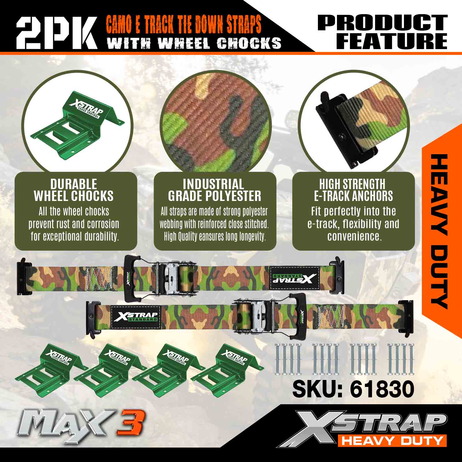 এক্সস্ট্র্যাপ হুইল চক টাই ডাউন কিট 4,400lb ব্রেক স্ট্রেংথ (2) হেভি ডিউটি ট্রেলার টায়ার র্যাচেট স্ট্র্যাপস (4) হুইল চক্স - এটিভি, ইউটিভি, লন মাওয়ার ফোর হুইলারের জন্য ই ট্র্যাক সিস্টেম - CAMO