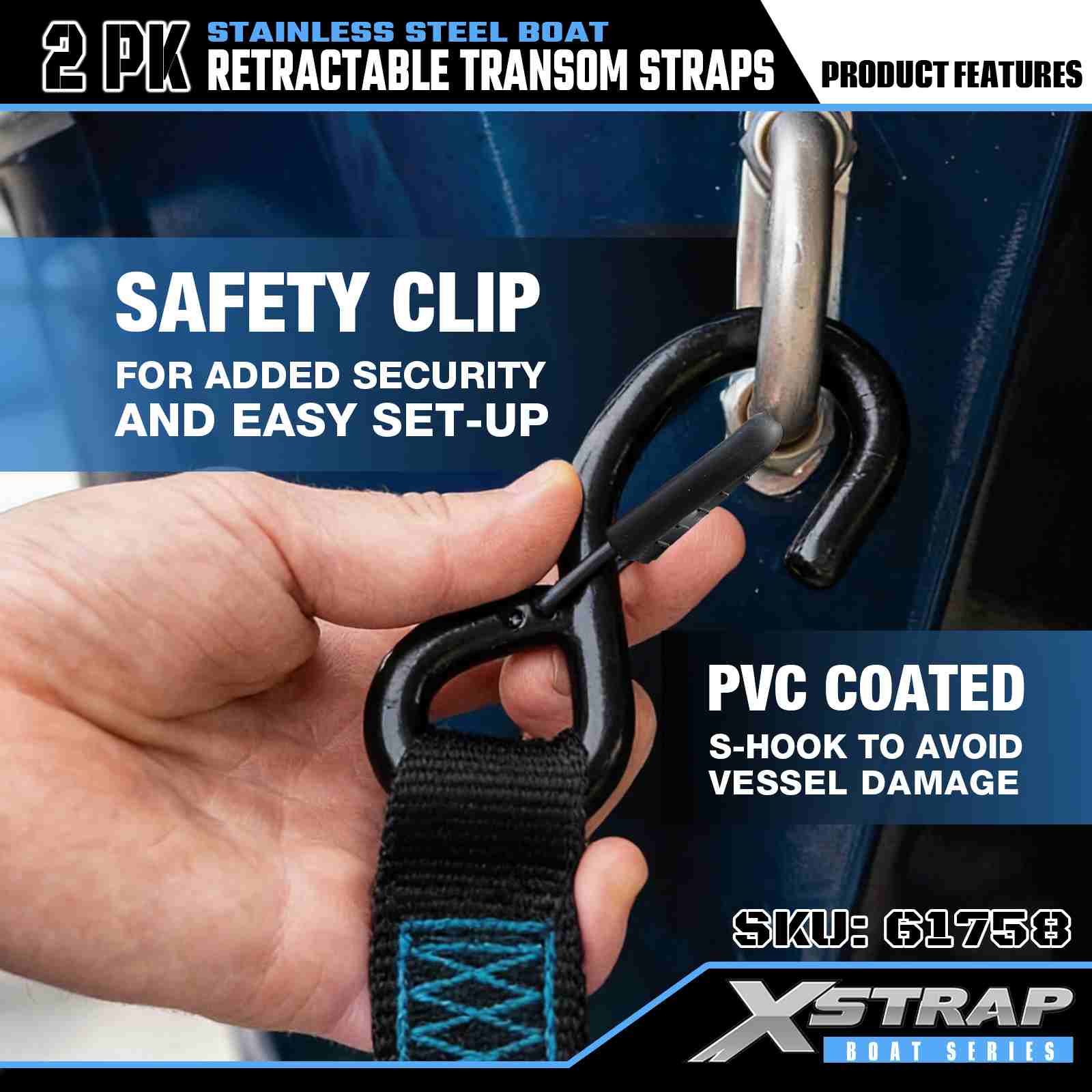 সেফটি এস হুক সহ 2” x 3.6’ 2PK বোট প্রত্যাহারযোগ্য ট্রান্সম স্ট্র্যাপ