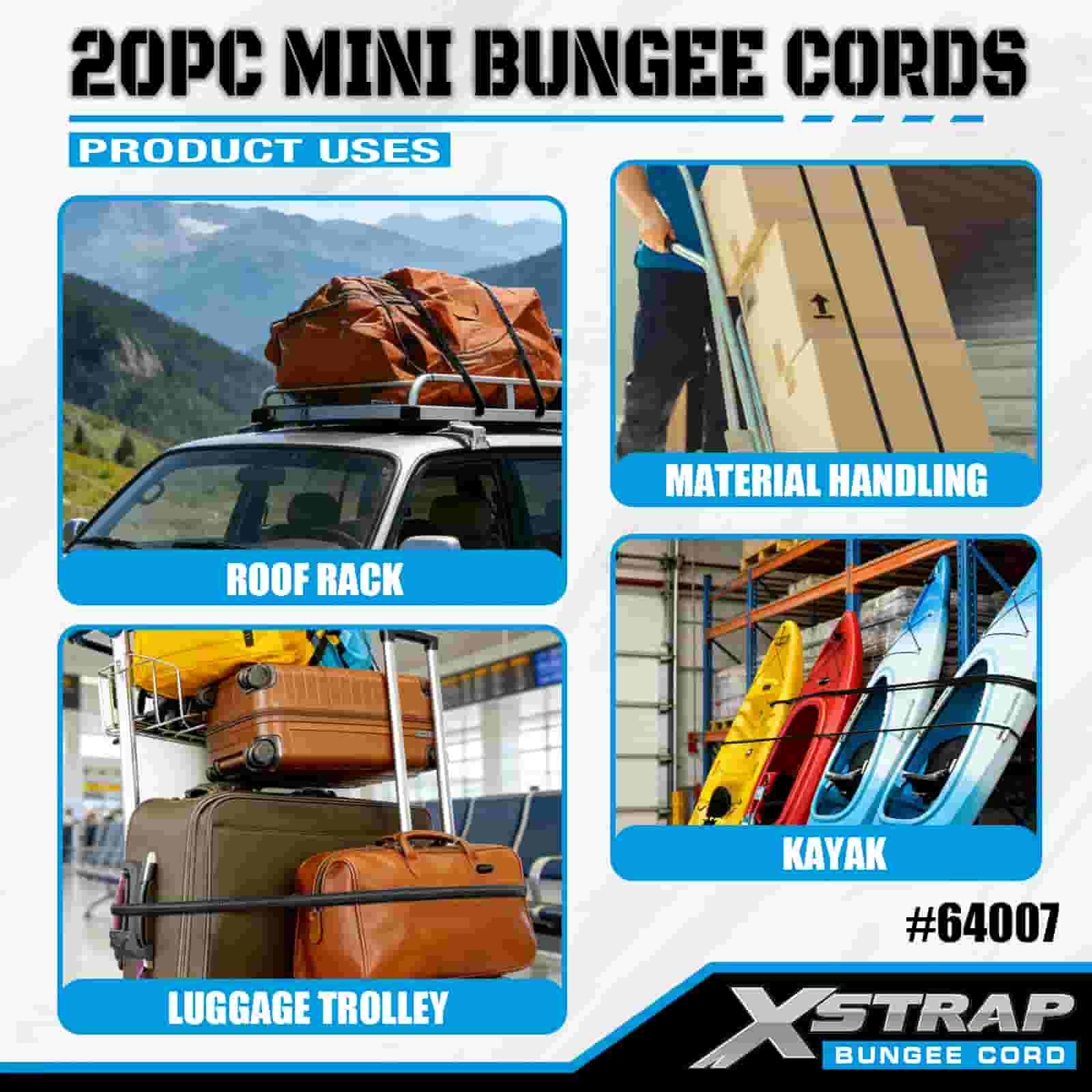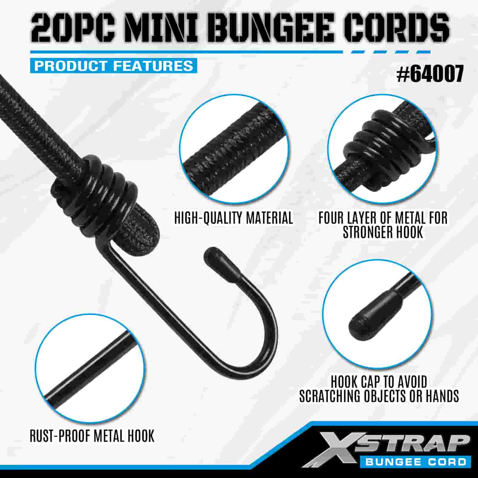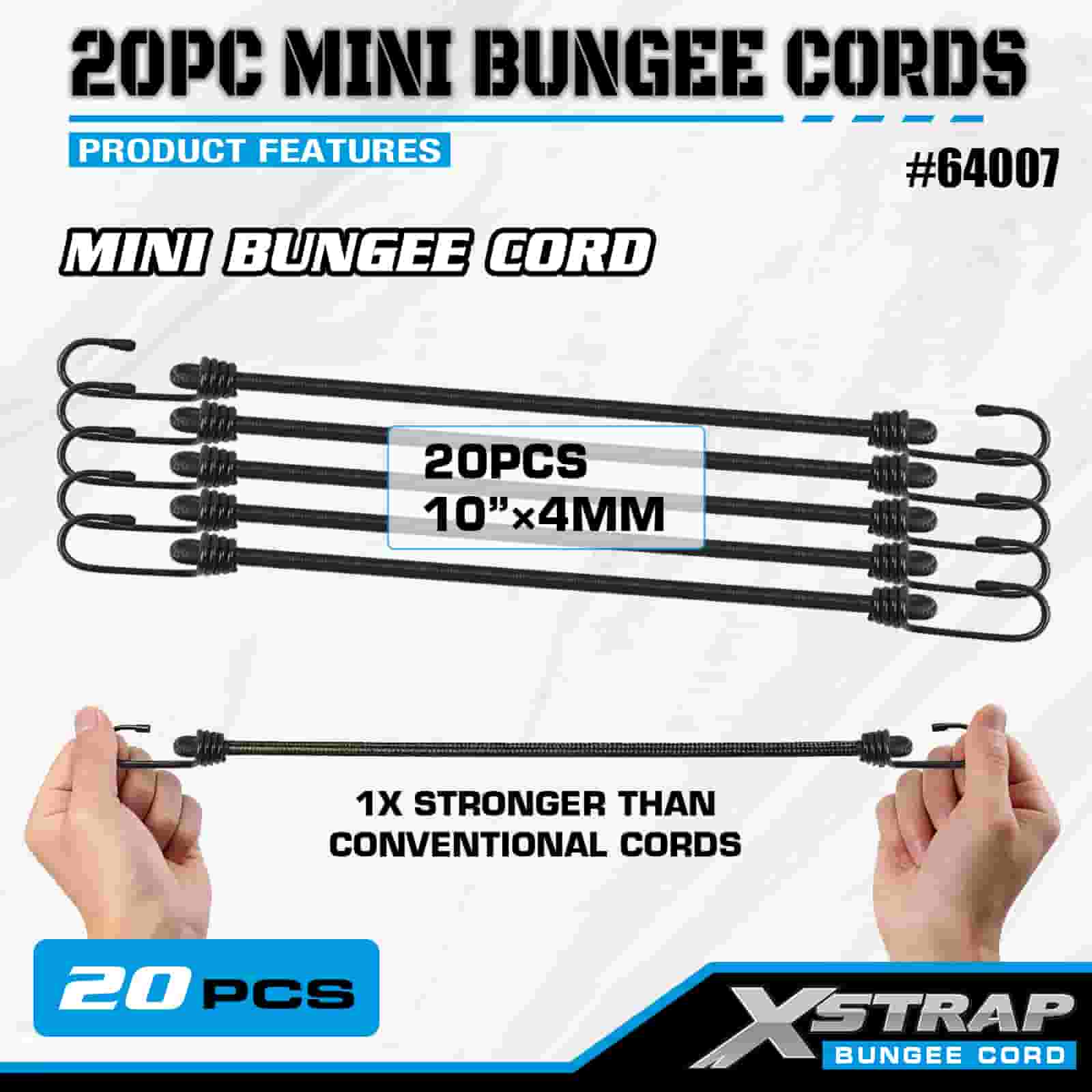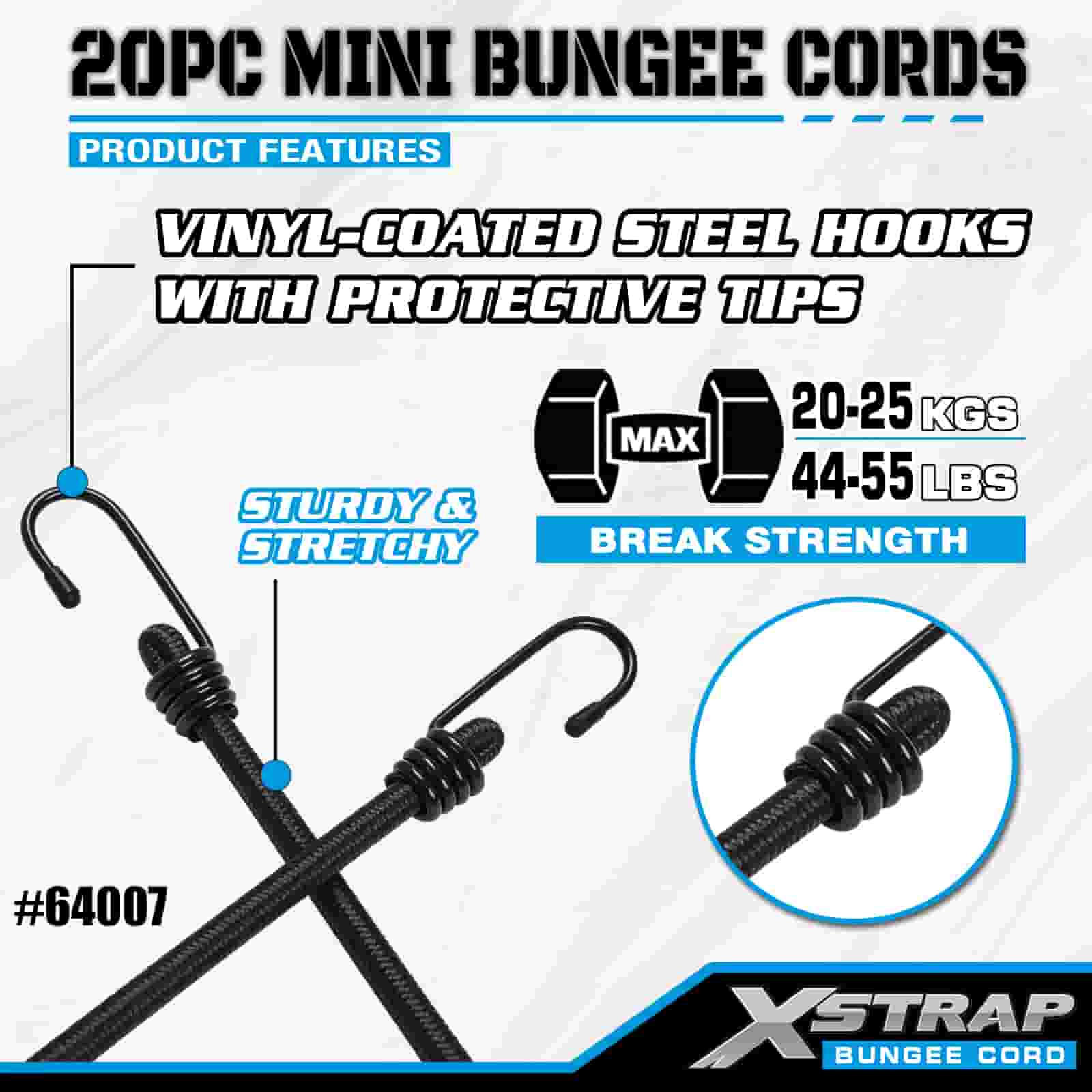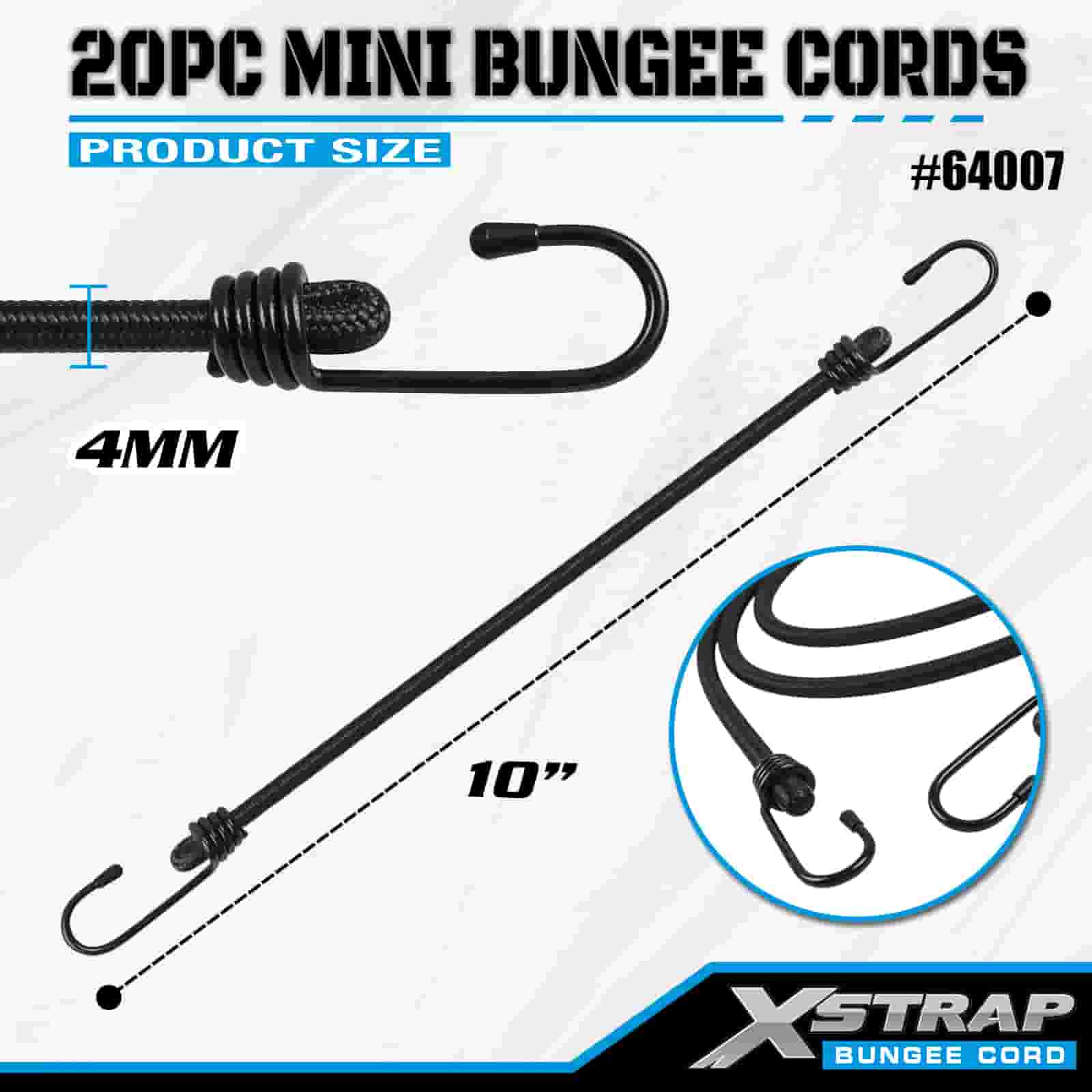 Xstrap 20PK MINI Bungee Cords 4 মিমি x 10", 44-55 পাউন্ড ব্রেক শক্তি প্রতিরক্ষামূলক টিপস এবং স্ট্যান্ডার্ড স্প্রিং হুক সহ স্টিলের হুকগুলির সাথে।