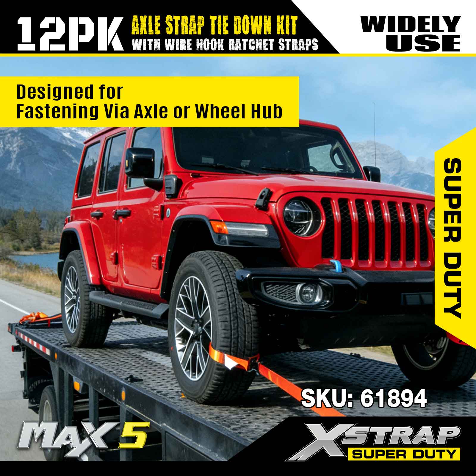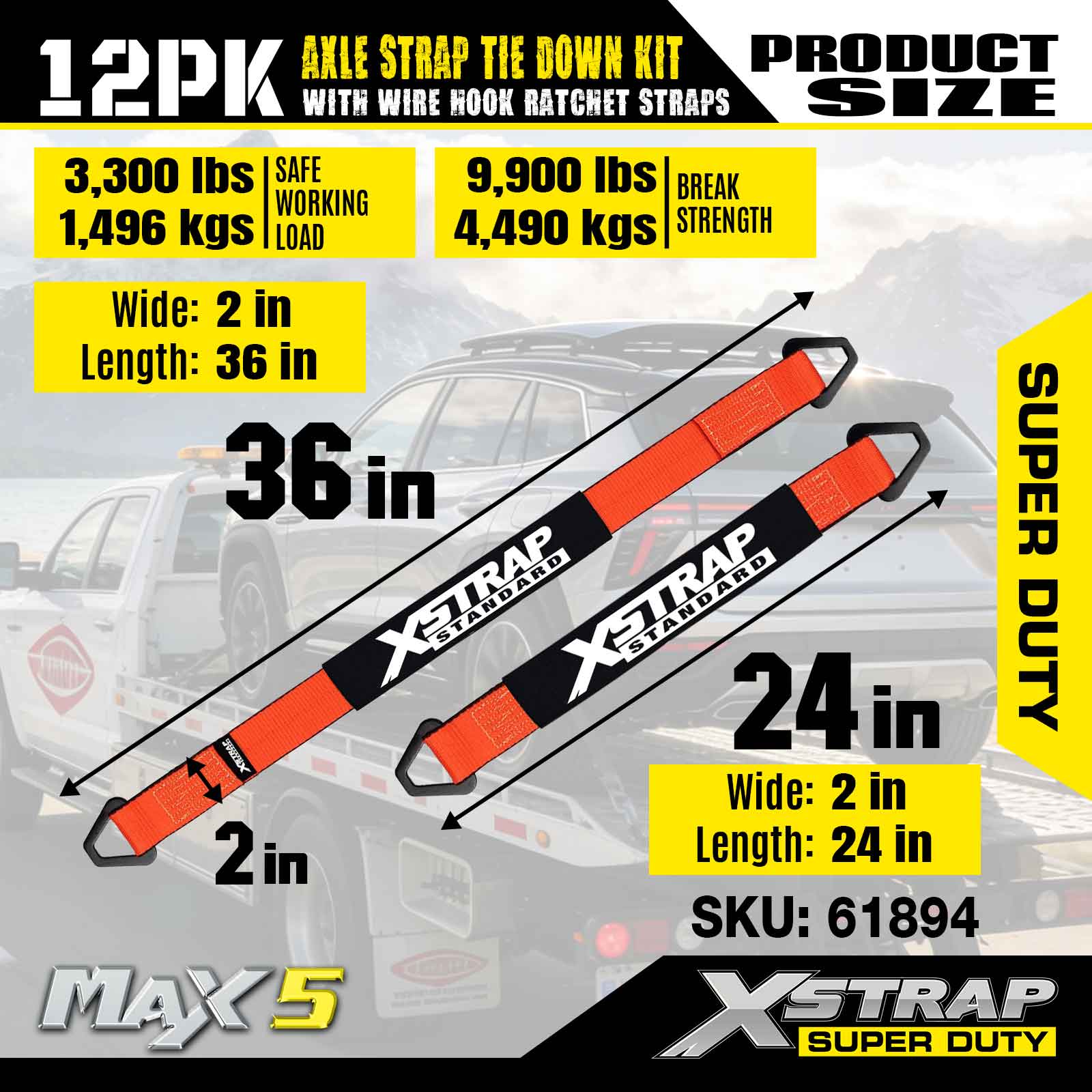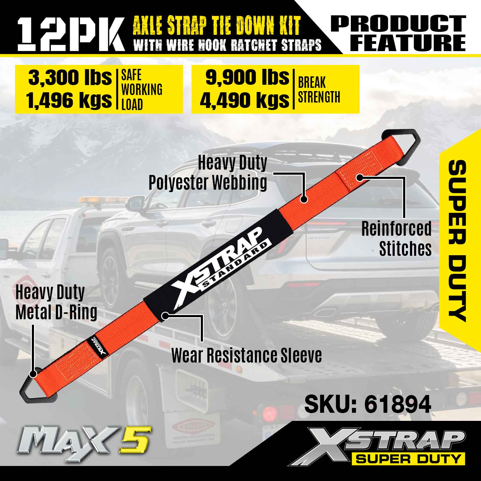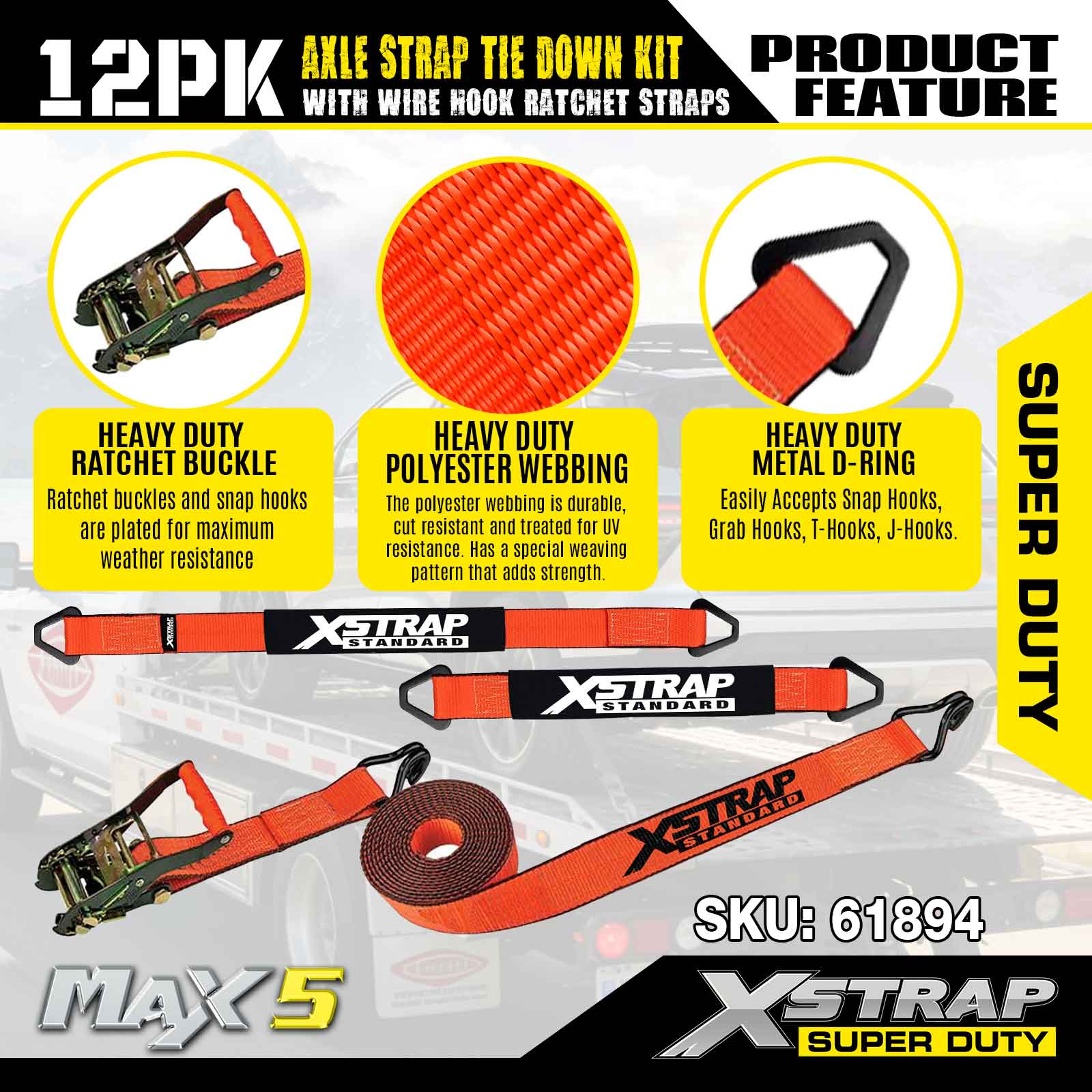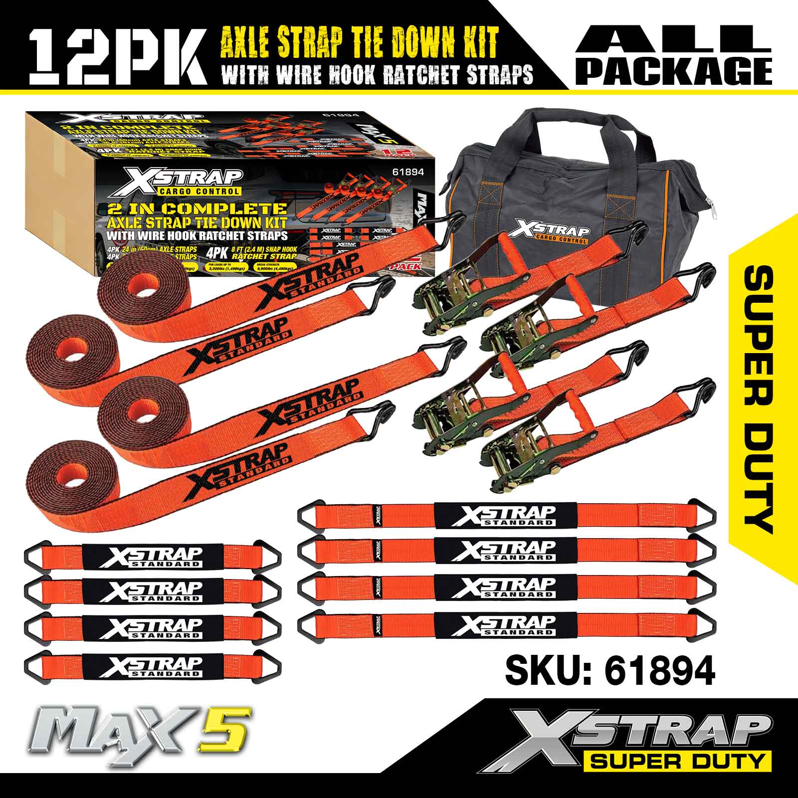 Xstrap 12PK এক্সেল স্ট্র্যাপ টাই ডাউন কিট (ওয়্যার হুক র্যাচেট স্ট্র্যাপ সহ) - সুপার ডিউটি। এটির 3,300LBS (1,496KGs) এর নিরাপদ কাজের লোড এবং 9,900LBS (4,490KGs) এর ব্রেকিং স্ট্রেথ রয়েছে।