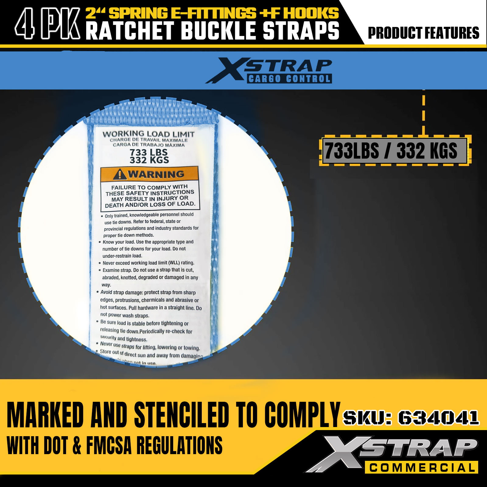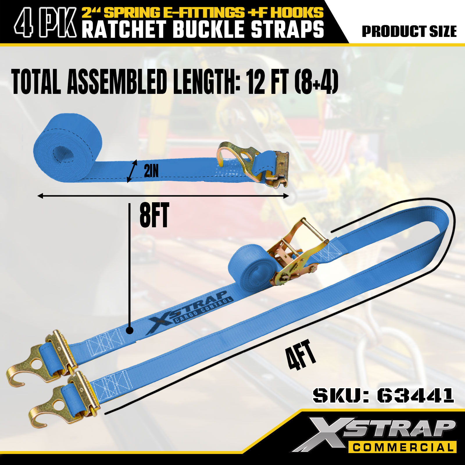 এক্সস্ট্র্যাপ 4 প্যাক র্যাচেট টাই-ডাউন স্ট্র্যাপ 2" x 12' পলিয়েস্টার সহ স্প্রিং ই-ফিটিংস এবং এফ হুক, 733 পাউন্ড এসডব্লিউএল এবং 332 পাউন্ড ব্রেকিং স্ট্রেন্থ ট্রাক, মুভিং, জেনারেল কার্গো পরিবহনের জন্য