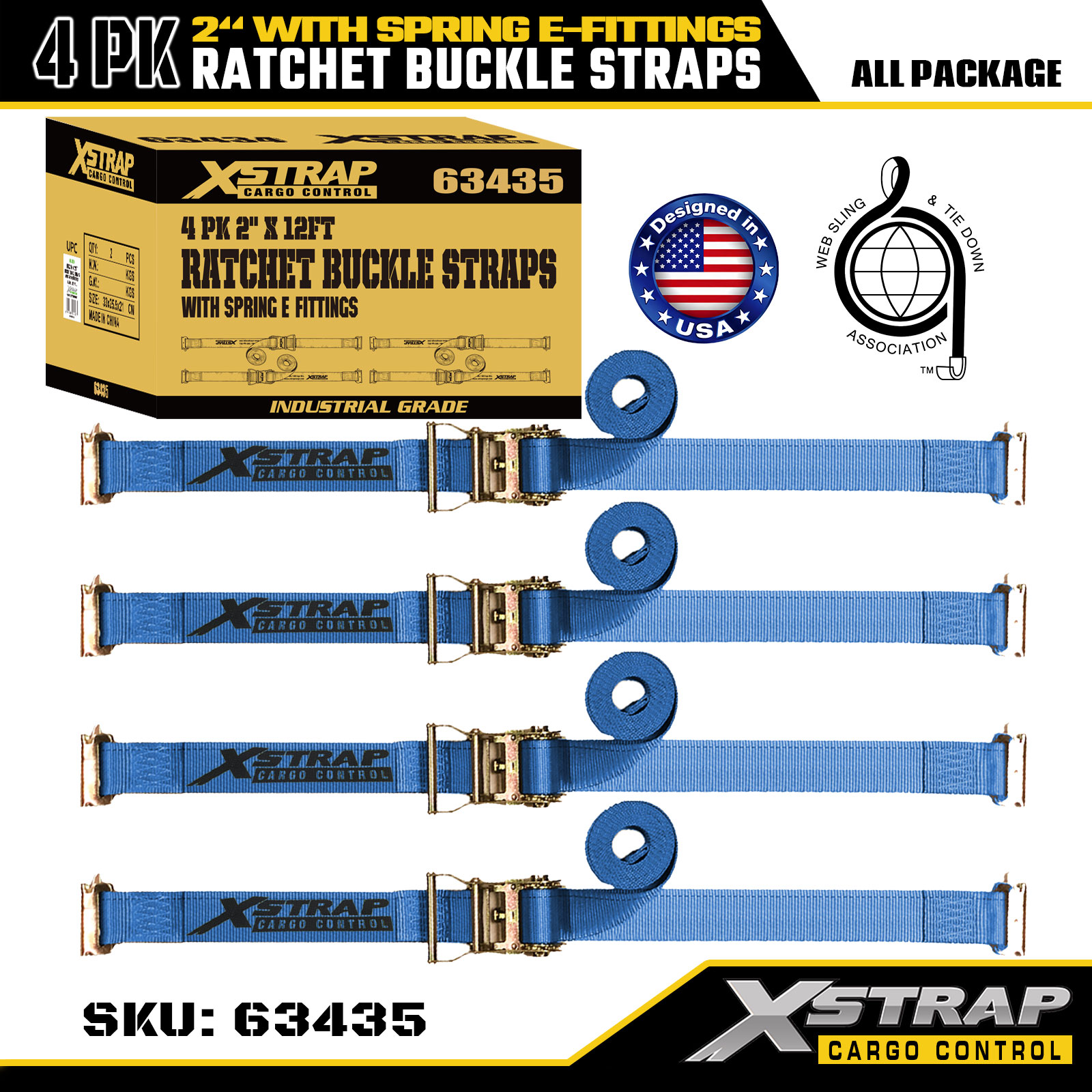 Xstrap 4 প্যাক র্যাচেট টাই-ডাউন স্ট্র্যাপ, 2" x 12' পলিয়েস্টার কার্গো সিকিউরিং স্ট্র্যাপ, স্প্রিং ই-ফিটিং সহ, 1467 পাউন্ড সেফ ওয়ার্কিং লোড (SWL) এবং 4401 পাউন্ড ব্রেকিং স্ট্রেন্থ, ট্রাক, মাওয়ার, ATV-এর জন্য