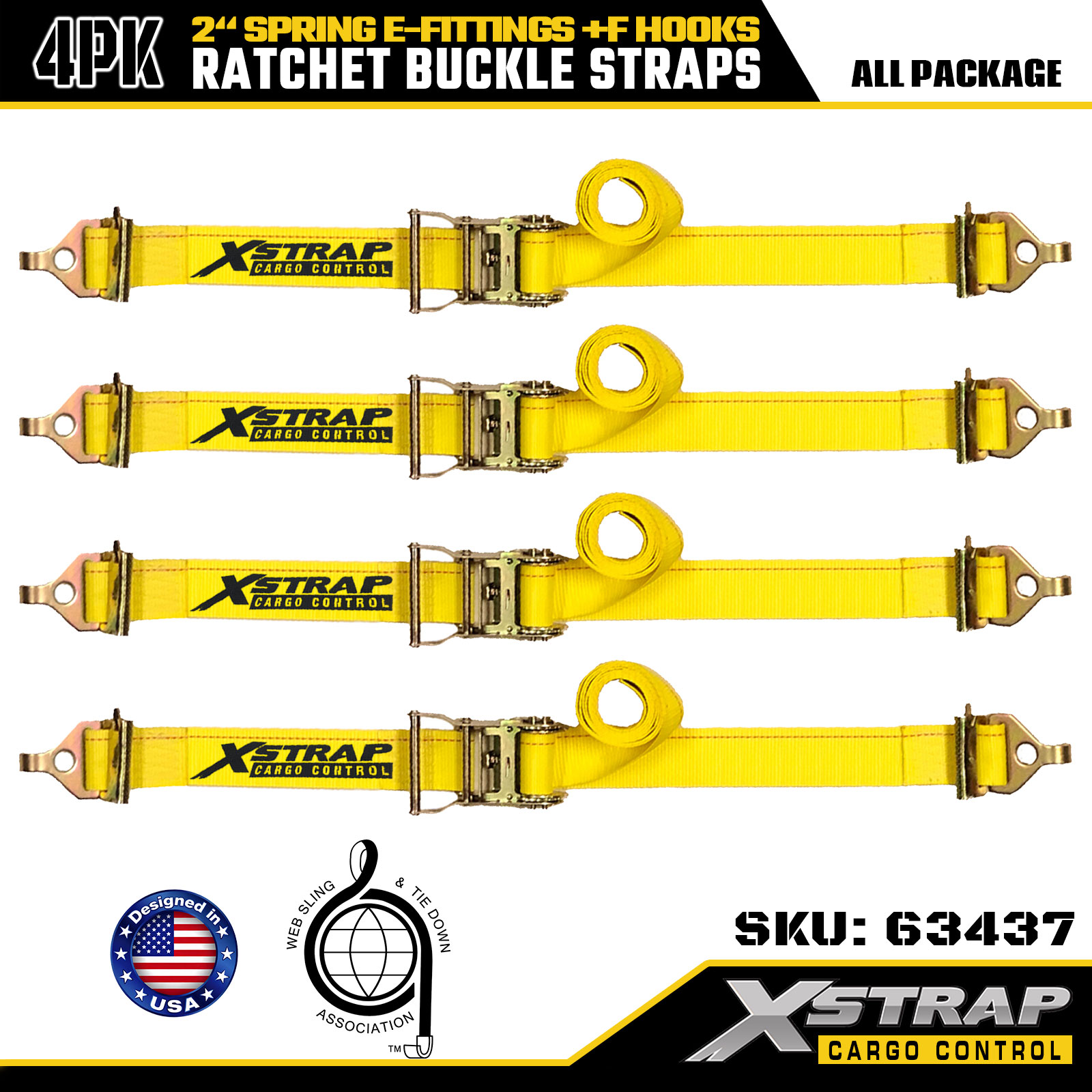 স্প্রিং ই-ফিটিংস এবং F হুক সহ 2" x 12' 4PK র্যাচেট স্ট্র্যাপ