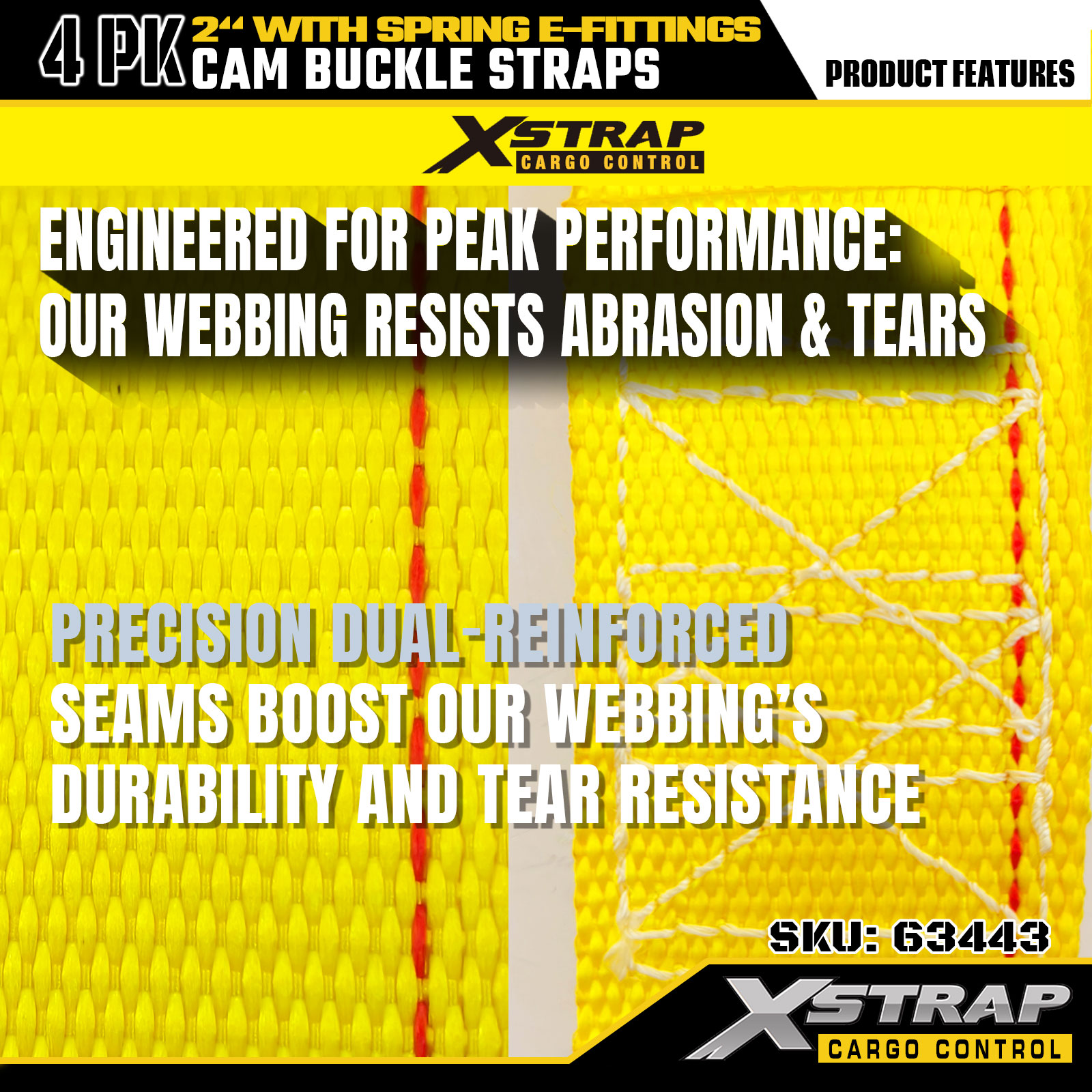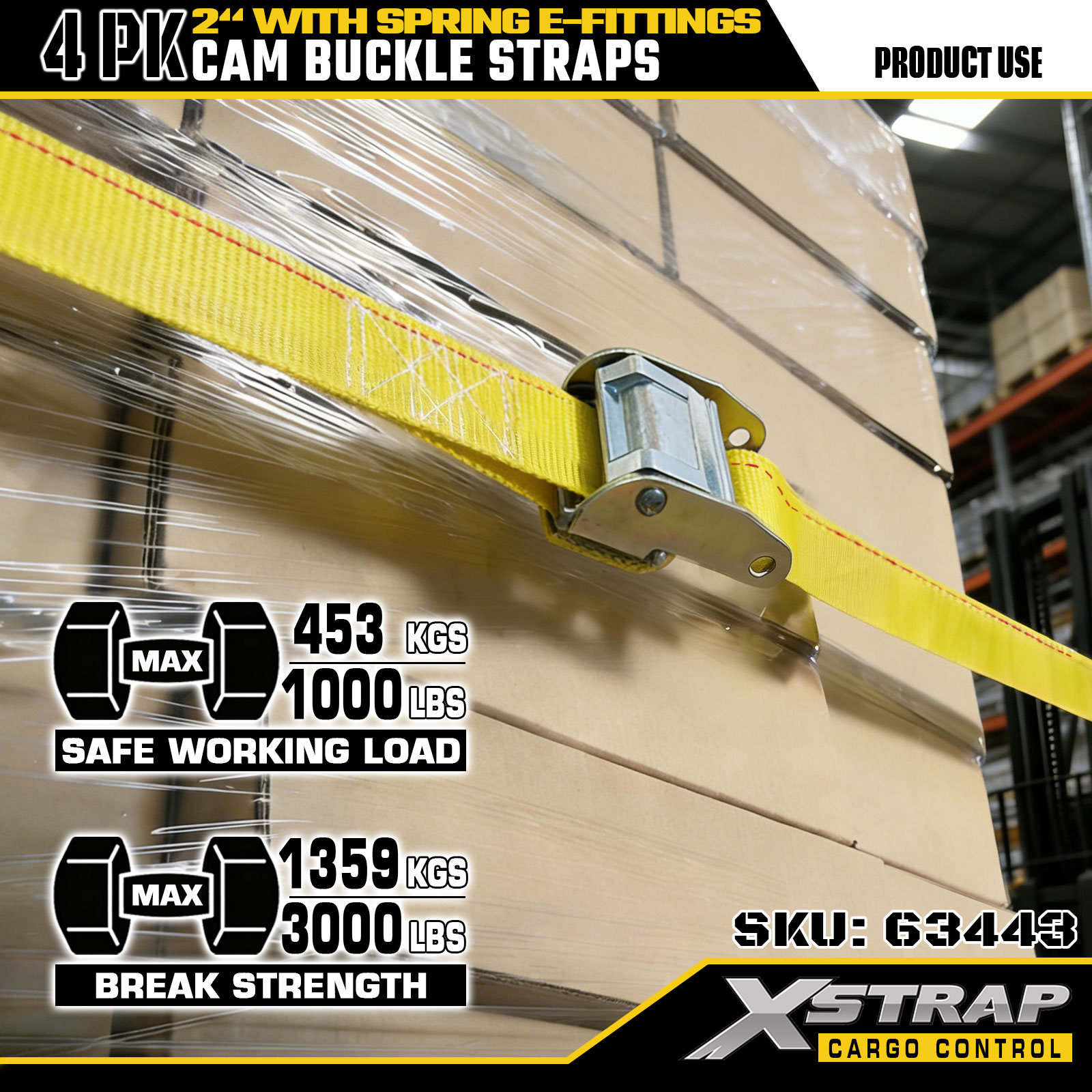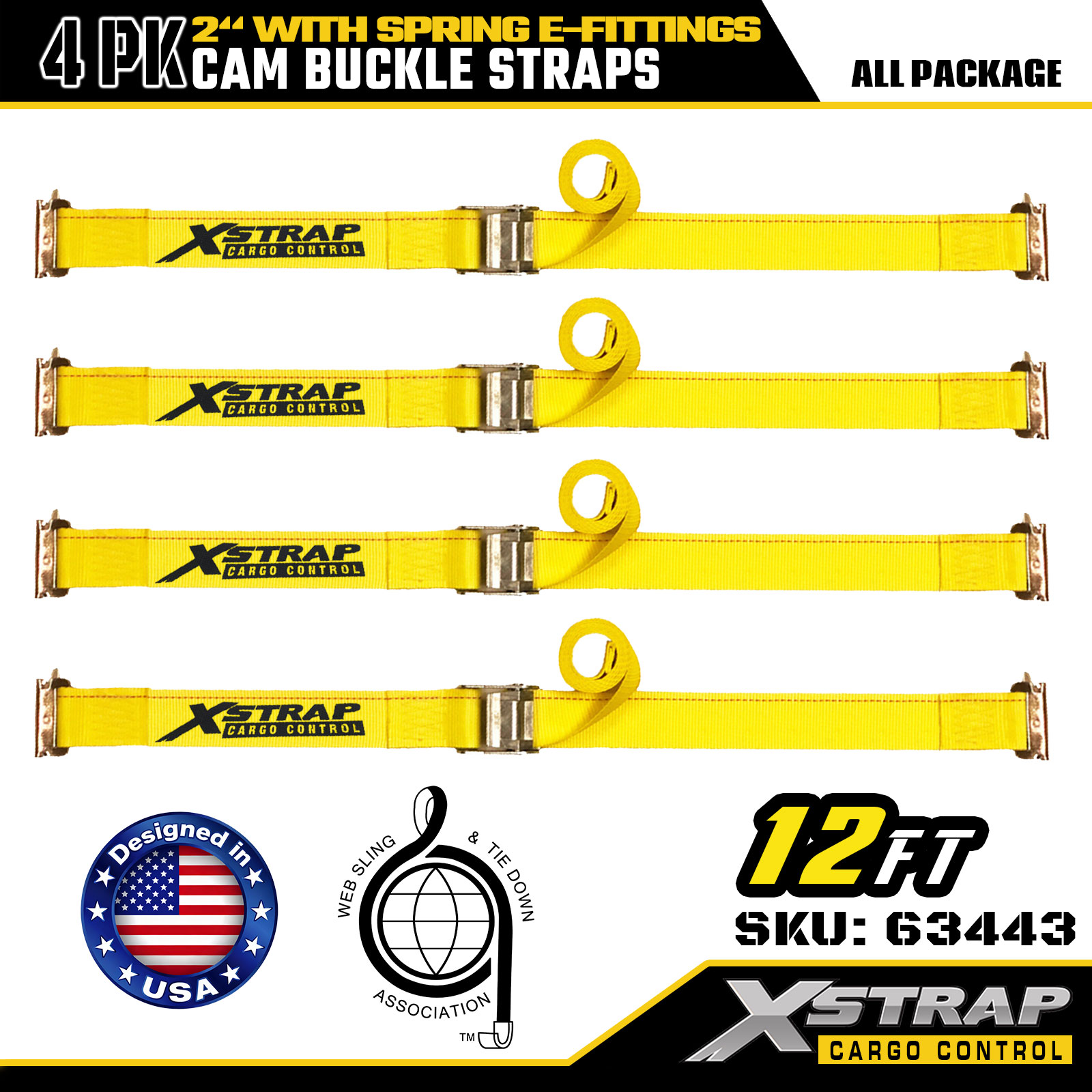 এক্সস্ট্র্যাপ 63443 4 প্যাক 2" x 12' স্প্রিং ই-ফিটিংস সহ হলুদ ক্যাম বাকল স্ট্র্যাপ, 1000 পাউন্ড এসডব্লিউএল এবং 453 পাউন্ড কার্গো হ্যান্ডলিং, রিলোকেশন এবং ট্রানজিটের জন্য ব্রেকিং স্ট্রেন্থ