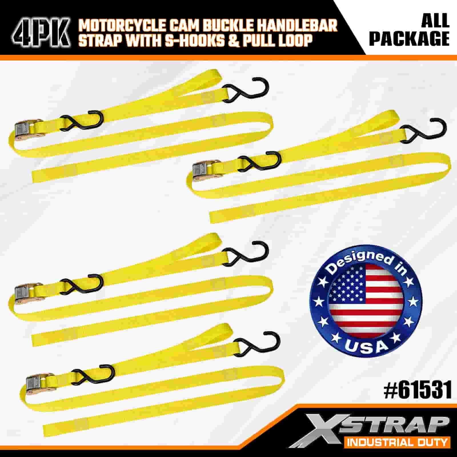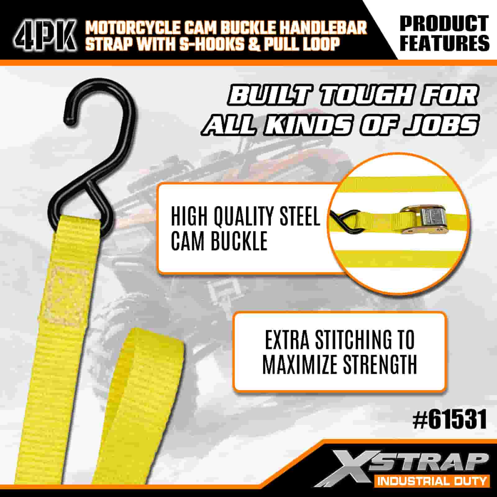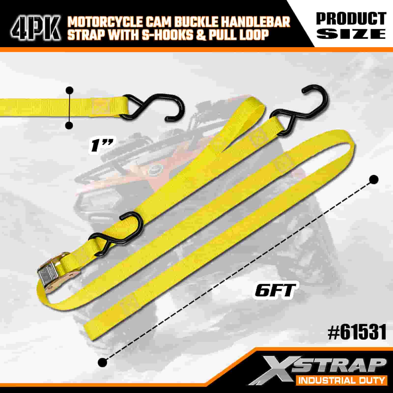 এক্সস্ট্র্যাপ 4PK মোটরসাইকেল ক্যাম বকল হ্যান্ডেলবার স্ট্র্যাপ সহ এস হুকস এবং পুল লুপ, 1” x 6’ পলিয়েস্টার টাই ডাউন স্ট্র্যাপ পুল ক্যাম বাকল স্ট্র্যাপ, 400lbs ক্যাপাসিটি কার্গো ল্যাশিং সিকিউরিং স্ট্র্যাপগুলি এস হুকগুলির সাথে সিকিউর প্রফেশনালের জন্য, ফ্ল্যাট কারগো ট্র্যাপ, ফ্ল্যাট কার্গো স্ট্র্যাপ।