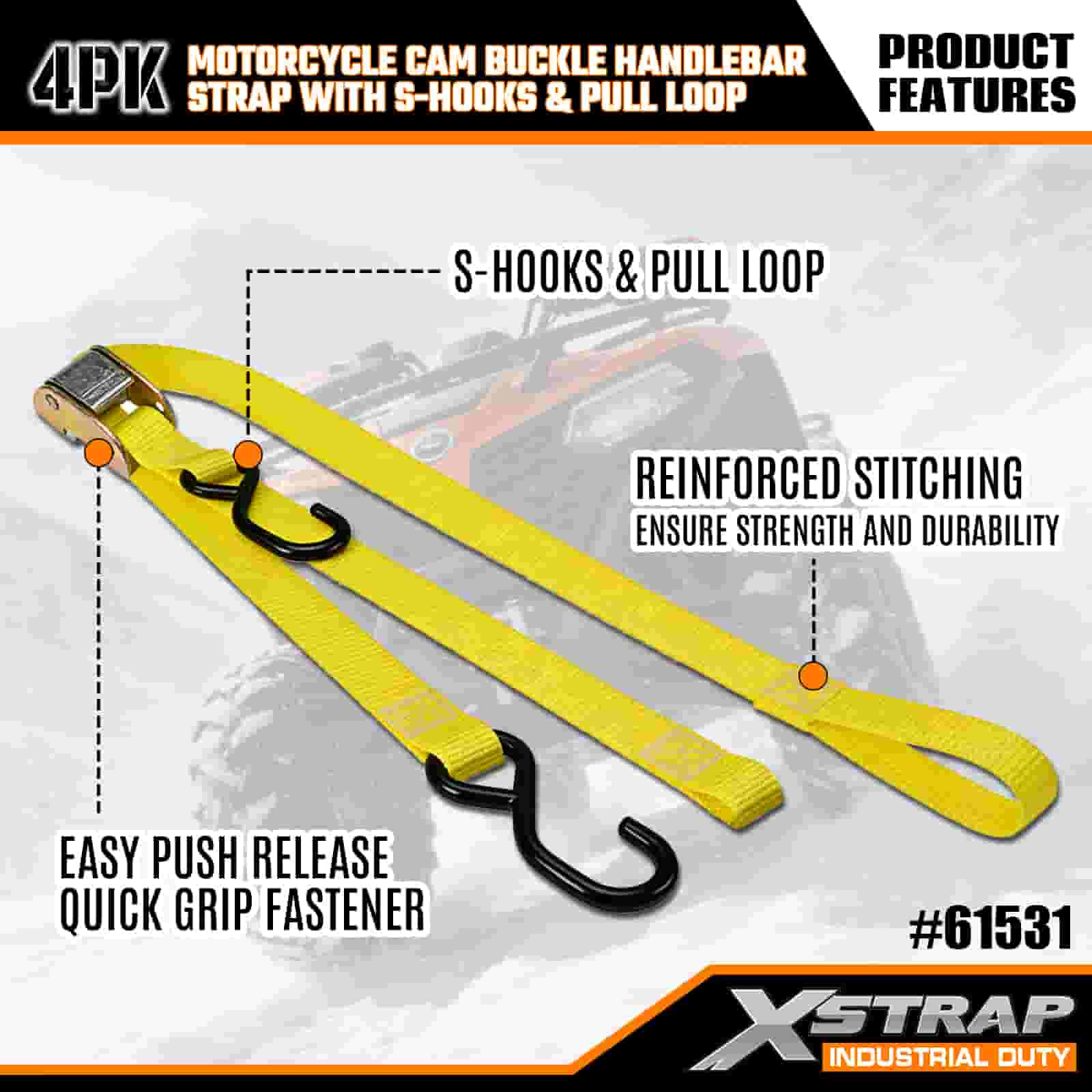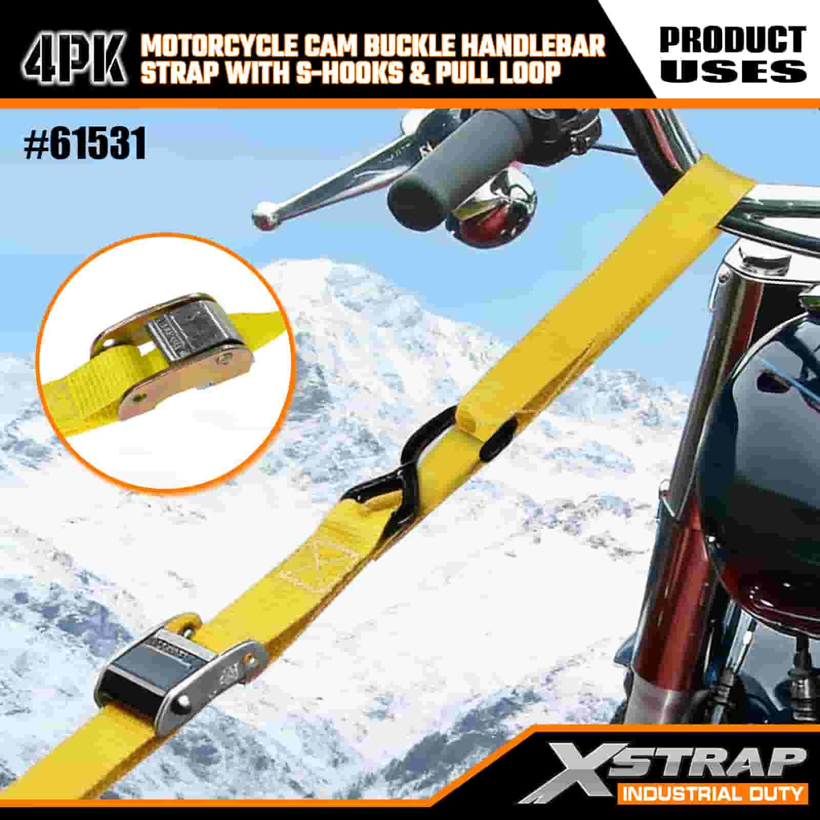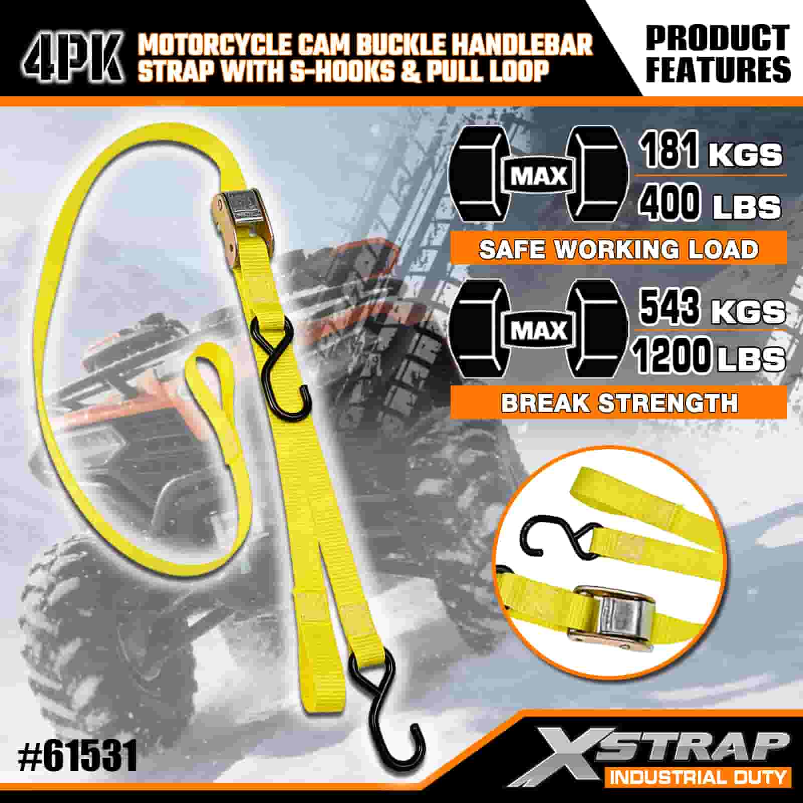 এক্সস্ট্র্যাপ 4PK মোটরসাইকেল ক্যাম বকল হ্যান্ডেলবার স্ট্র্যাপ সহ এস হুকস এবং পুল লুপ, 1” x 6’ পলিয়েস্টার টাই ডাউন স্ট্র্যাপ পুল ক্যাম বাকল স্ট্র্যাপ, 400lbs ক্যাপাসিটি কার্গো ল্যাশিং সিকিউরিং স্ট্র্যাপগুলি এস হুকগুলির সাথে সিকিউর প্রফেশনালের জন্য, ফ্ল্যাট কারগো ট্র্যাপ, ফ্ল্যাট কার্গো স্ট্র্যাপ।