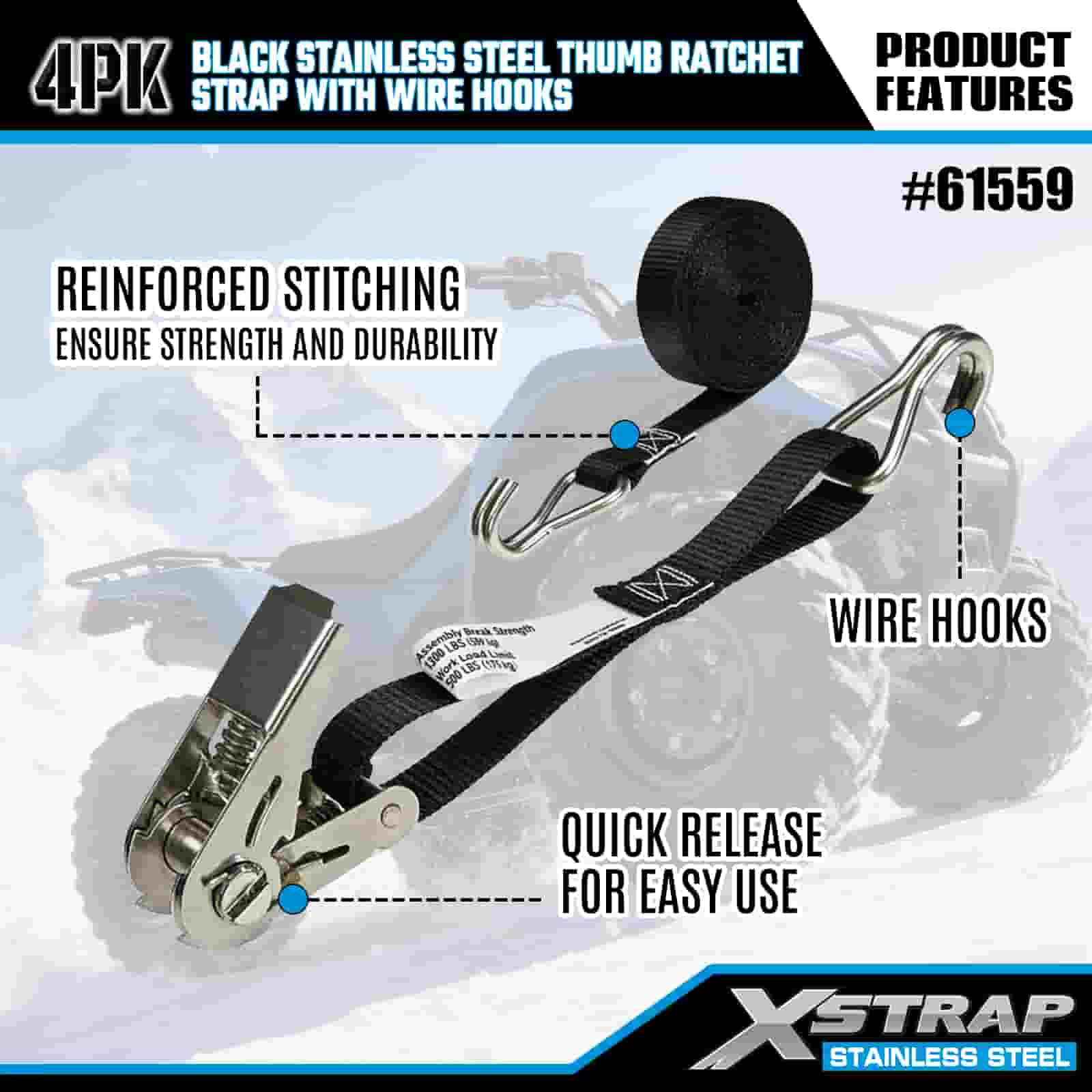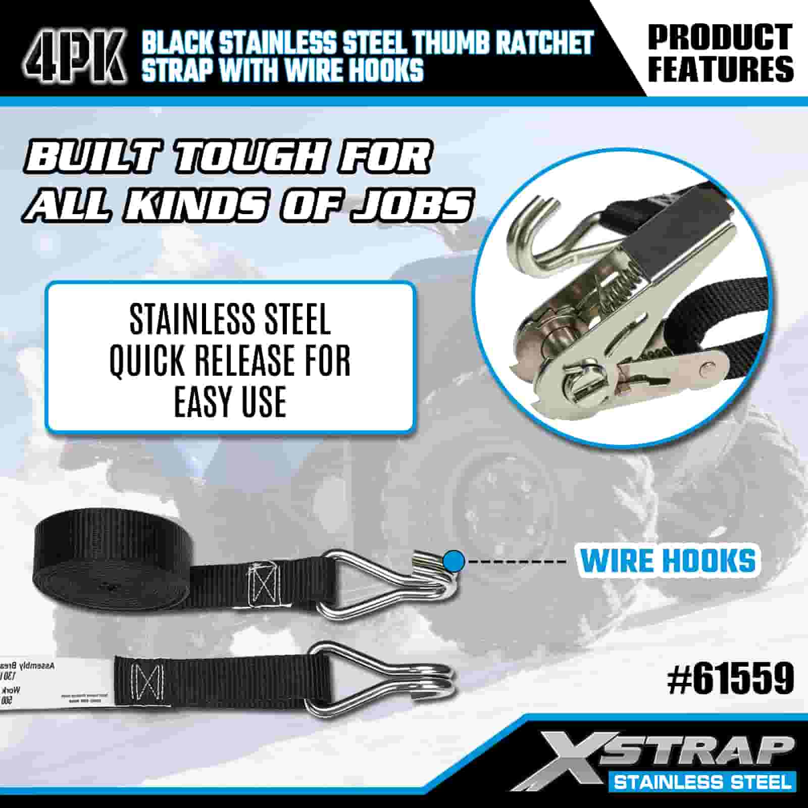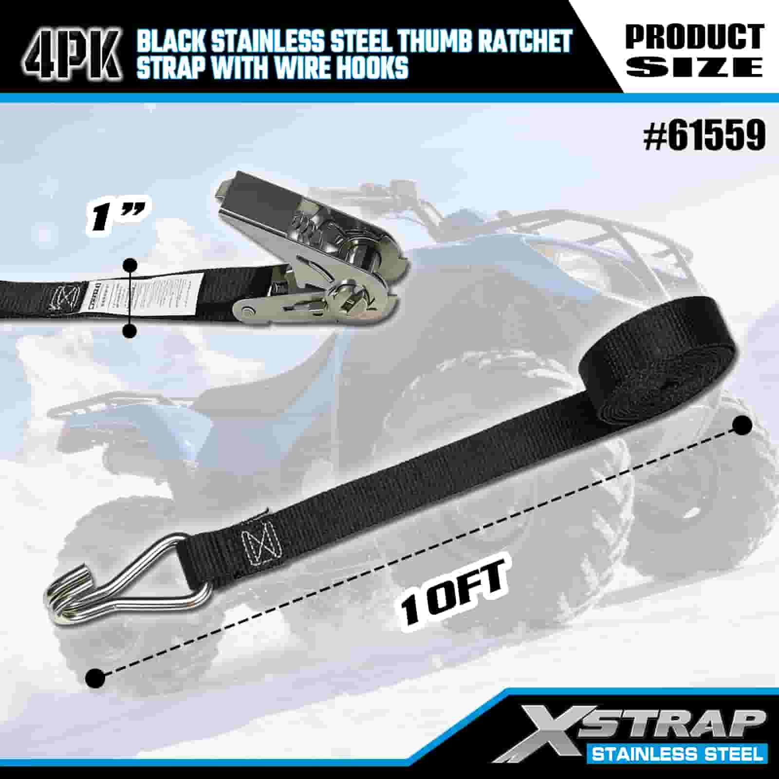 Xstrap 4PK ব্ল্যাক স্টেইনলেস স্টীল থাম্ব র্যাচেট ওয়্যার হুক সহ, 1” x 10’ পলিয়েস্টার টাই ডাউন স্ট্র্যাপ র্যাচেট স্ট্র্যাপ, ট্রেলারের জন্য ওয়্যার হুক সহ 500lbs ক্যাপাসিটি কার্গো ল্যাশিং সিকিউরিং স্ট্র্যাপ, ফ্ল্যাট বেড ট্রেলার স্কি বোট, ছোট ইকুই কারমেন্ট।