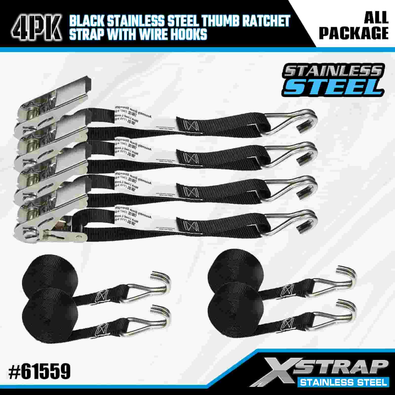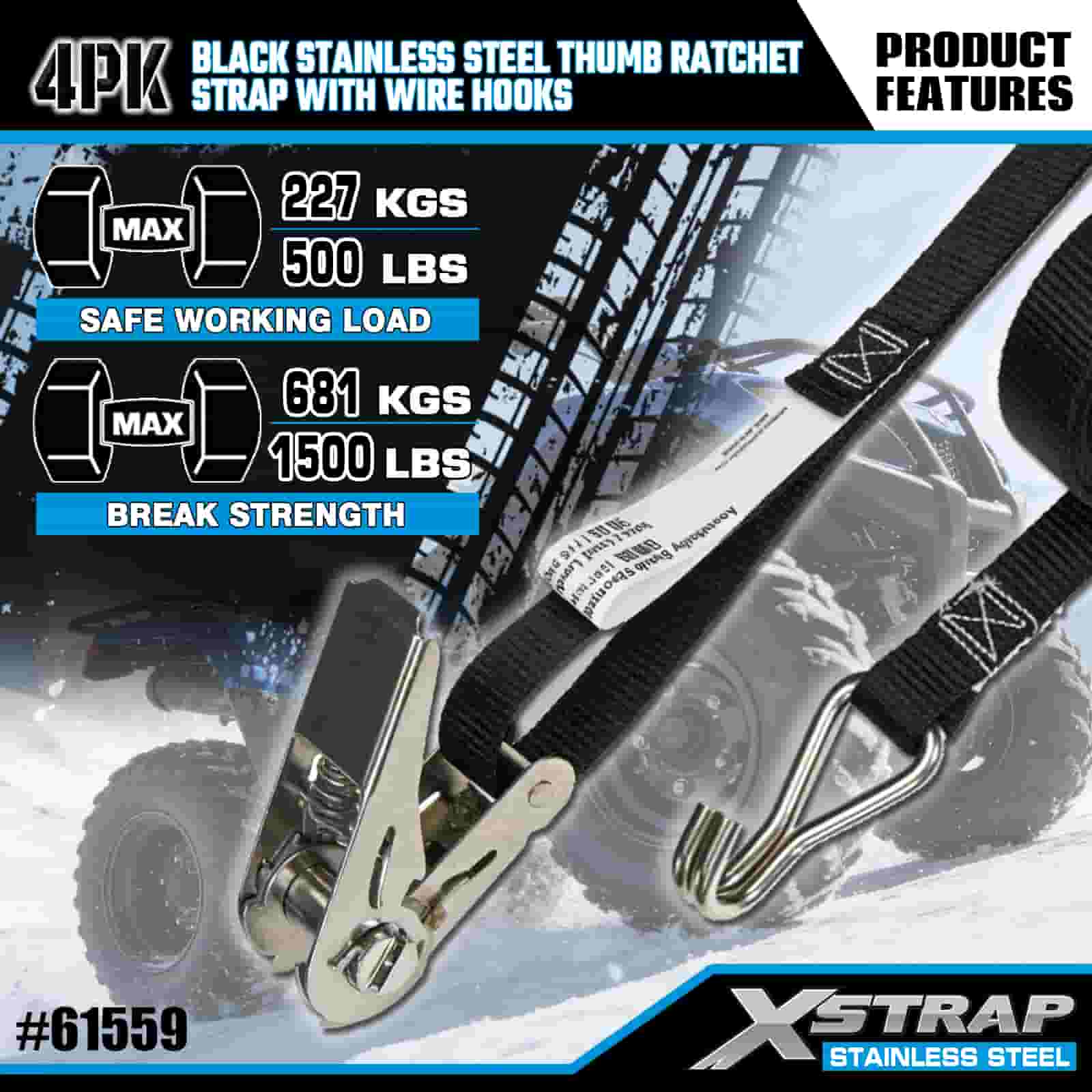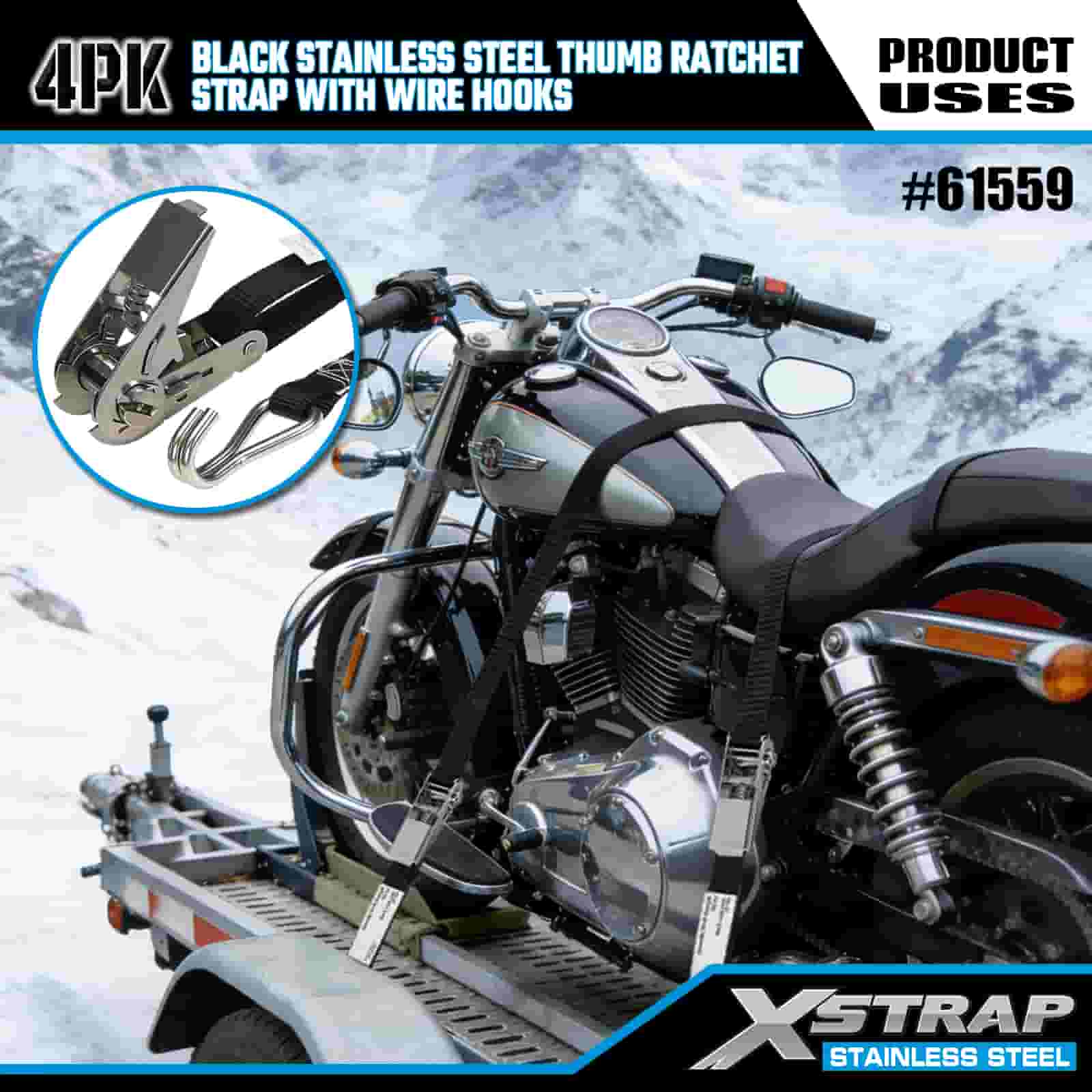 Xstrap 4PK ব্ল্যাক স্টেইনলেস স্টীল থাম্ব র্যাচেট ওয়্যার হুক সহ, 1” x 10’ পলিয়েস্টার টাই ডাউন স্ট্র্যাপ র্যাচেট স্ট্র্যাপ, ট্রেলারের জন্য ওয়্যার হুক সহ 500lbs ক্যাপাসিটি কার্গো ল্যাশিং সিকিউরিং স্ট্র্যাপ, ফ্ল্যাট বেড ট্রেলার স্কি বোট, ছোট ইকুই কারমেন্ট।