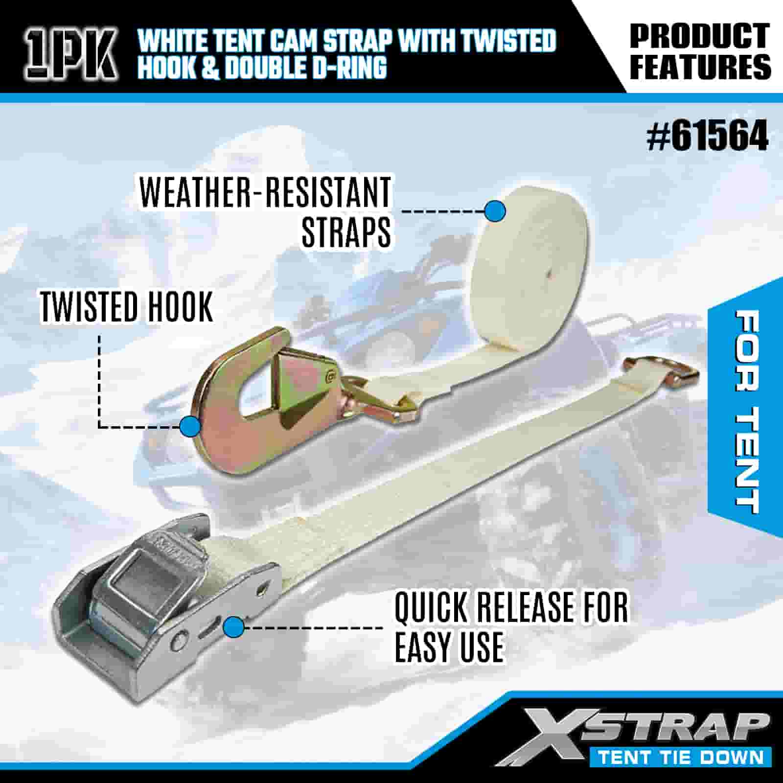 টুইস্টেড হুক এবং ডাবল ডি রিং সহ 1” x 15’ হোয়াইট টেন্ট ক্যামের স্ট্র্যাপ