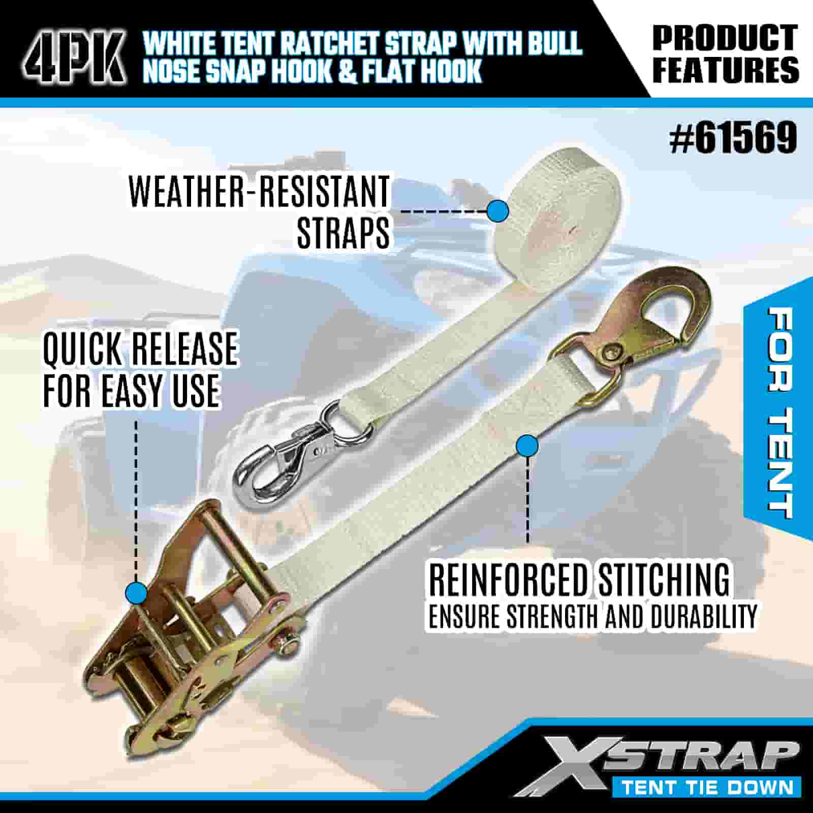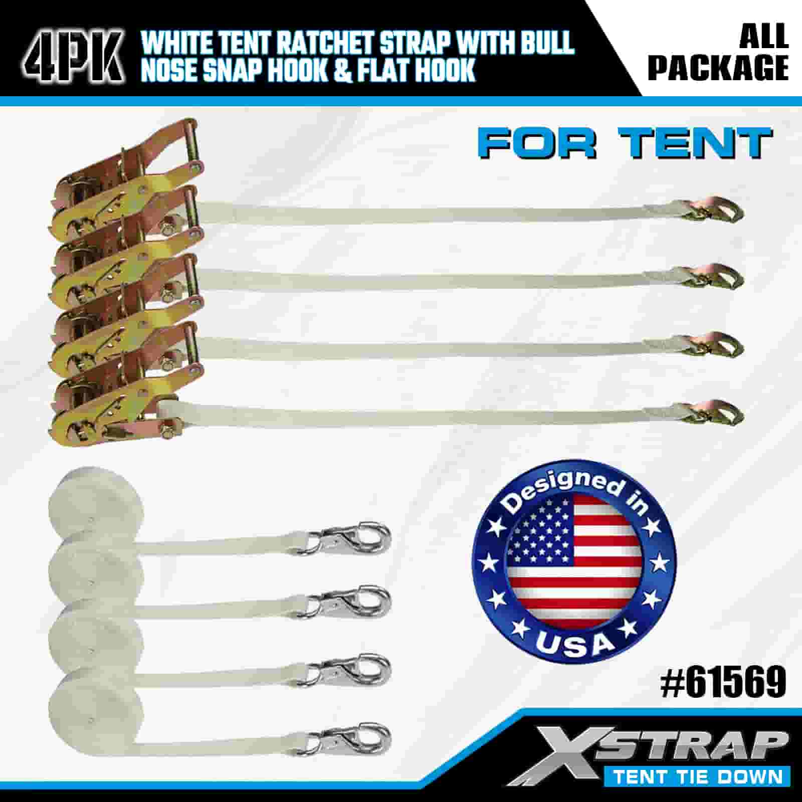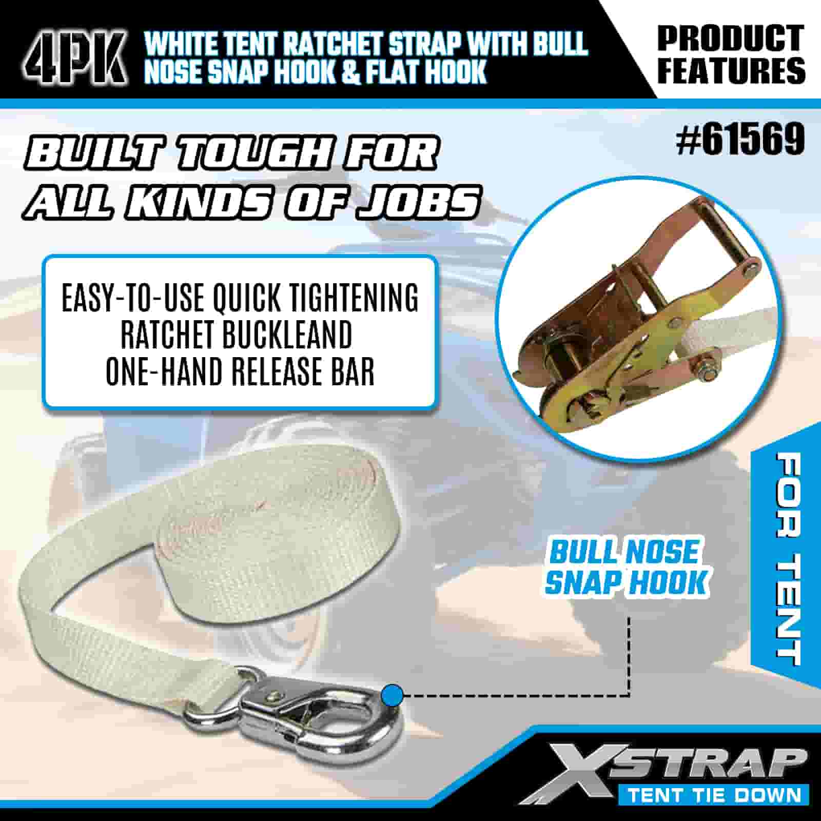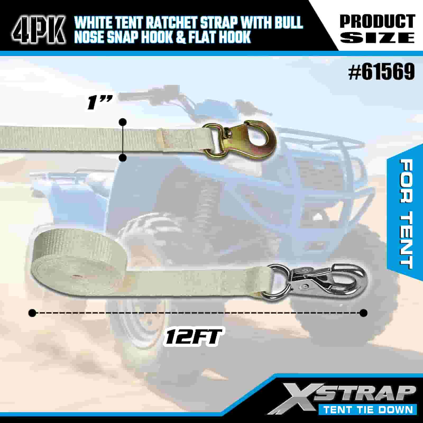বুল নোজ স্ন্যাপ হুক এবং ফ্ল্যাট হুক সহ Xstrap 4PK হোয়াইট টেন্ট র্যাচেট স্ট্র্যাপ, 1” x 12’ পলিয়েস্টার টাই ডাউন স্ট্র্যাপ র্যাচেট স্ট্র্যাপ, 1100lbs ক্যাপাসিটি কার্গো ল্যাশিং সিকিউরিং স্ট্র্যাপস নোজ স্ন্যাপ হুক এবং ফ্ল্যাট হুক কার্গো কন্ট্রোলের জন্য, তাঁবু ঠিক করা।