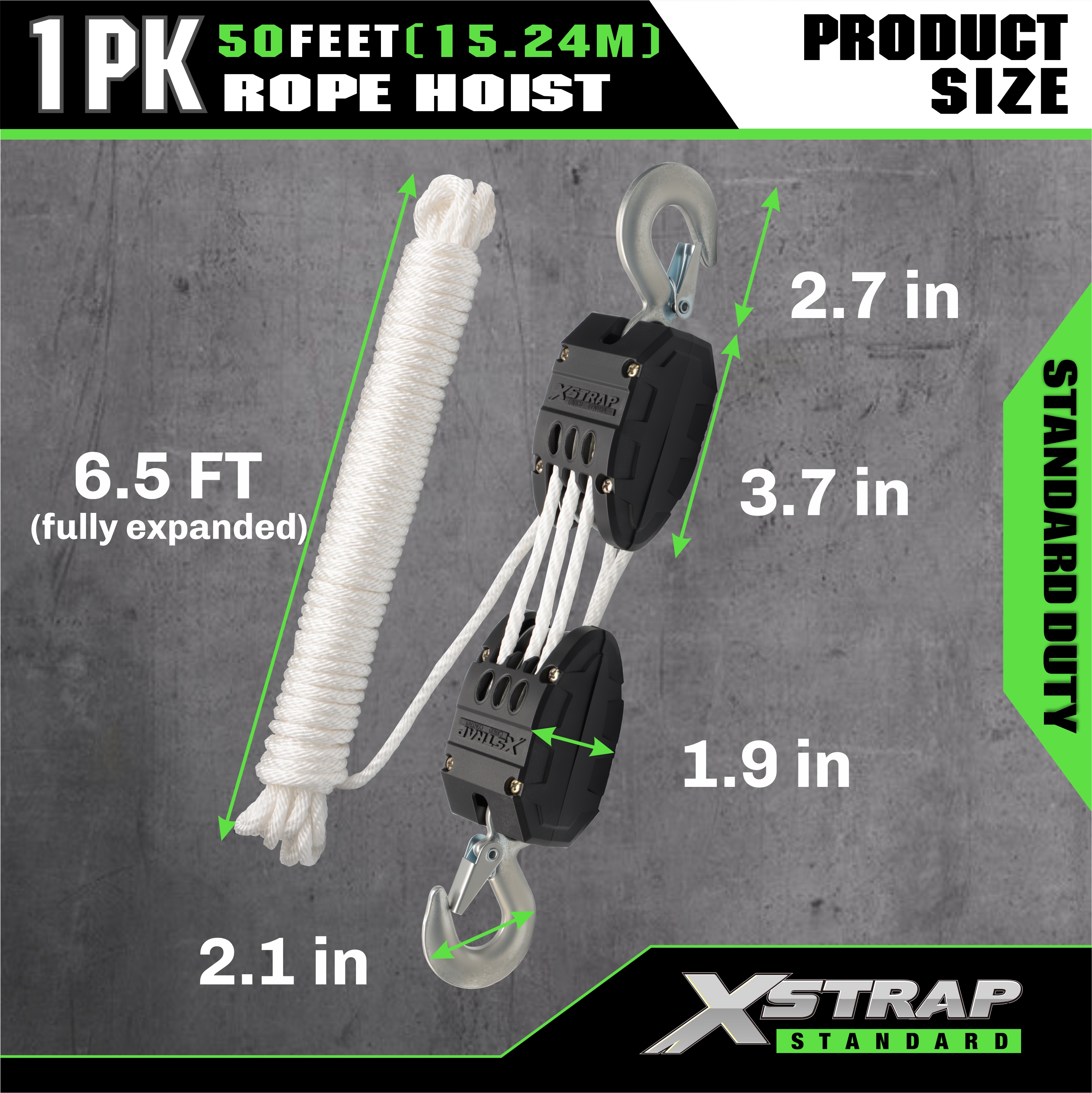- কাজের লোড: 2000LB ব্রেকিং স্ট্রেন্থ এবং 1000 পাউন্ড লোড ক্যাপ সহ 50 ফুট পলি দড়ি