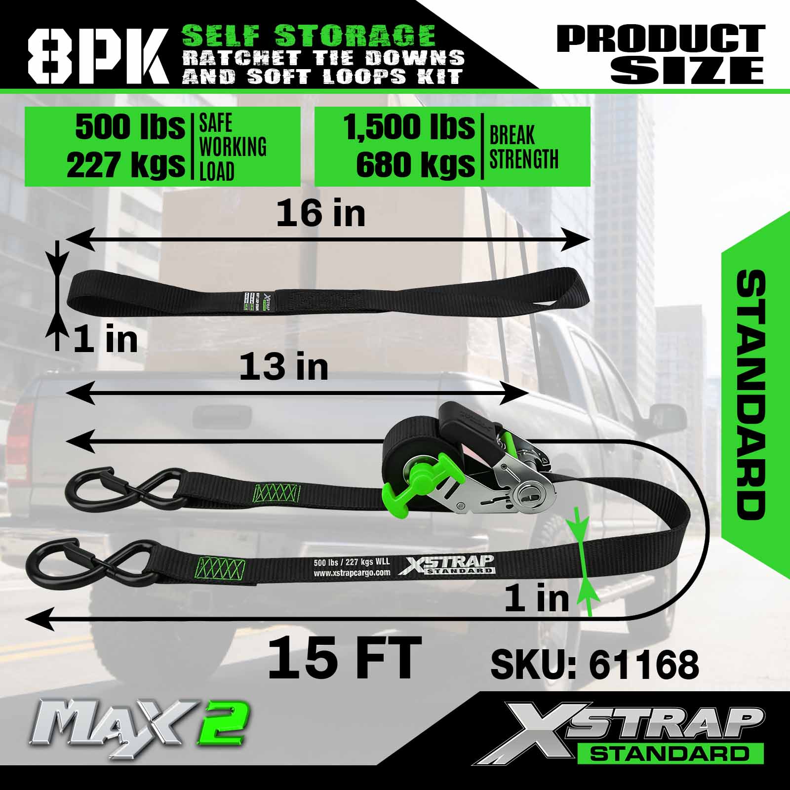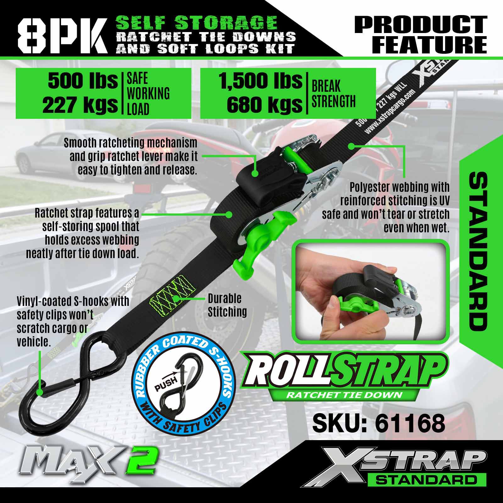 এক্সস্ট্র্যাপ 61168 1 ইঞ্চি 15 ফুট সেলফ স্টোরেজ র্যাচেট টাই ডাউনস 500LB SWL
