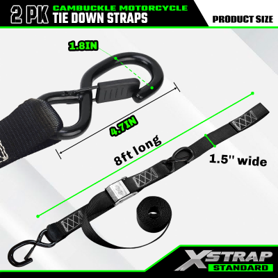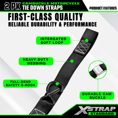 - হেভি ডিউটি স্ট্যান্ডার্ড ডিজাইন: এক্সস্ট্র্যাপ মোটরসাইকেল টাই ডাউন স্ট্র্যাপগুলি উচ্চ শক্তির ওয়েবিং দিয়ে তৈরি এবং 2200lbs এর বিরতি শক্তি রয়েছে, যা মোটরসাইকেল, ATV, UTV এবং ডার্ট বাইকগুলিকে সুরক্ষিত করার জন্য সেরা পছন্দ করে তোলে। আপনি যখন দ্রুত ভ্রমণের জন্য আমাদের ক্যাম বাকল স্ট্র্যাপ ব্যবহার করেন, তখন এক্সস্ট্র্যাপ টাই ডাউন স্ট্র্যাপগুলি অতুলনীয় স্থায়িত্ব এবং নিরাপত্তা নিশ্চিত করে৷