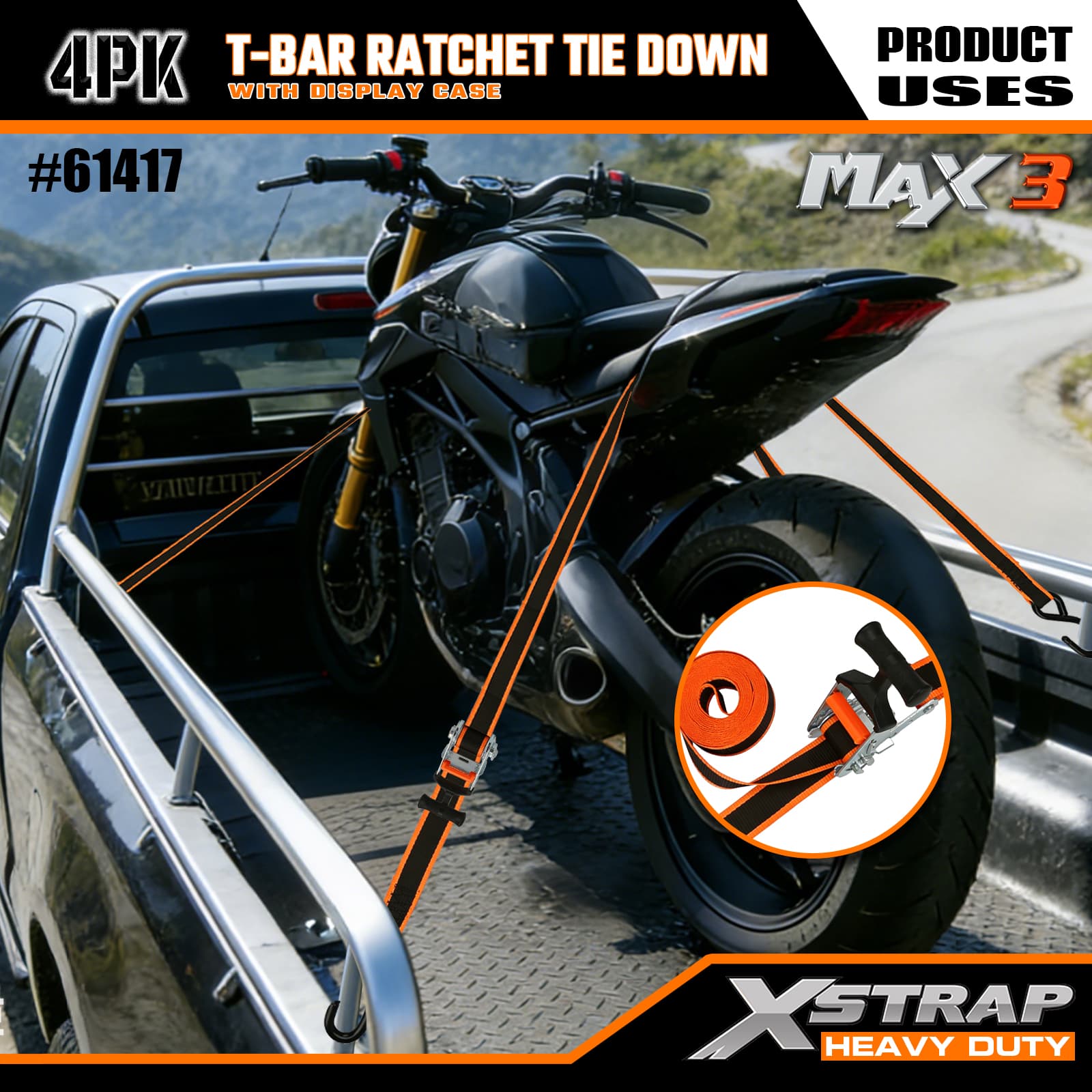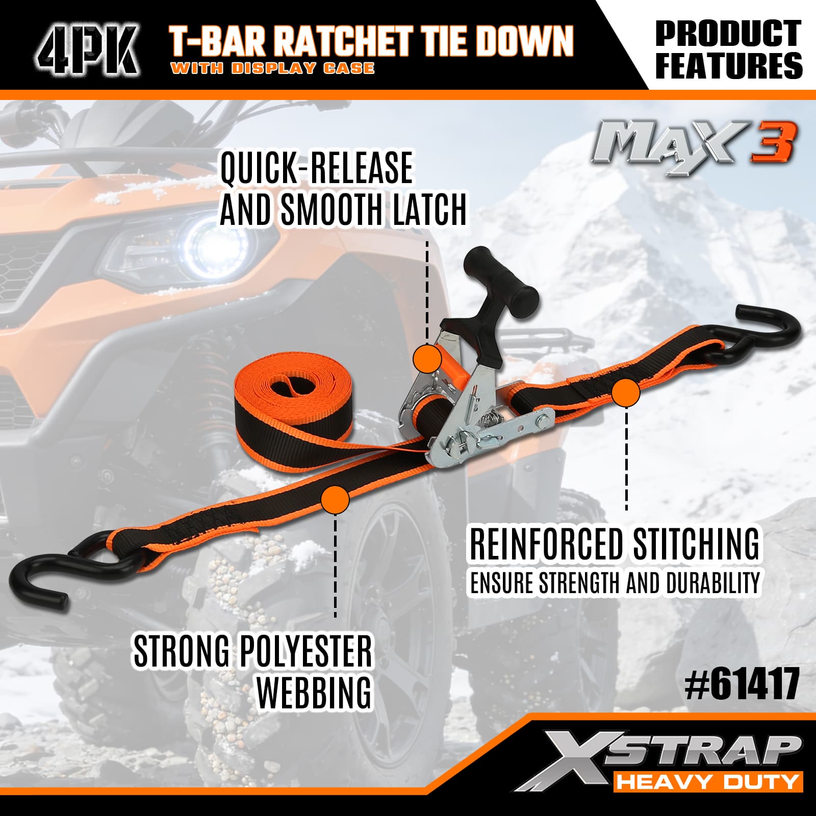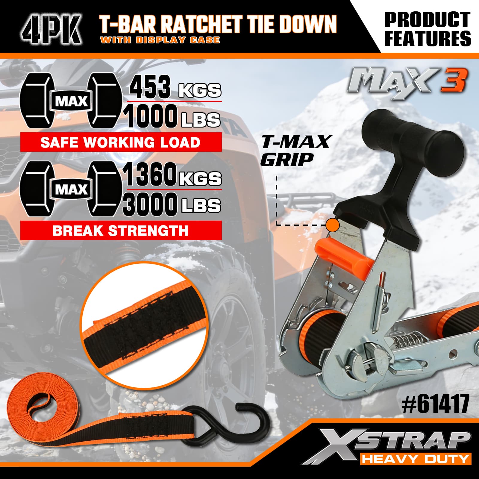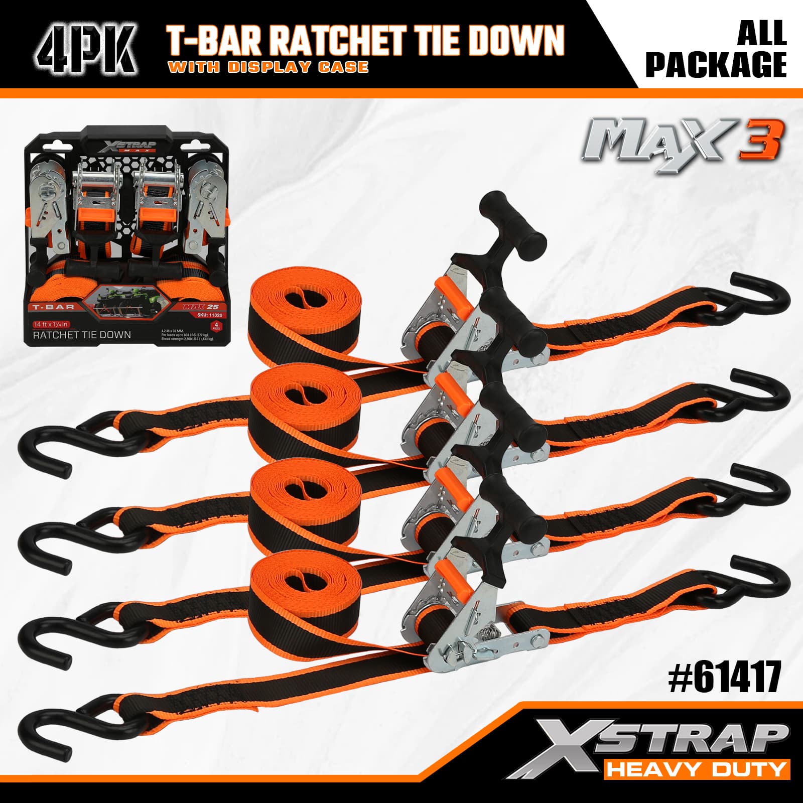 Xstrap 4 প্যাক টি-ম্যাক্স গ্রিপ র্যাচেট টাই ডাউন, 1-1/4 ” x 14’ পলিয়েস্টার টাই ডাউন স্ট্র্যাপ পুল র্যাচেট স্ট্র্যাপ, পিকআপ ট্রাক, এসইউভি, কার টপ সাইকেল, বোর সাইকেল এফ-কি, এফ হুকগুলির জন্য 1000 পাউন্ড ক্ষমতার কার্গো ল্যাশিং সিকিউরিং স্ট্র্যাপ স্নোমোবাইল, লন ট্রাক্টর।