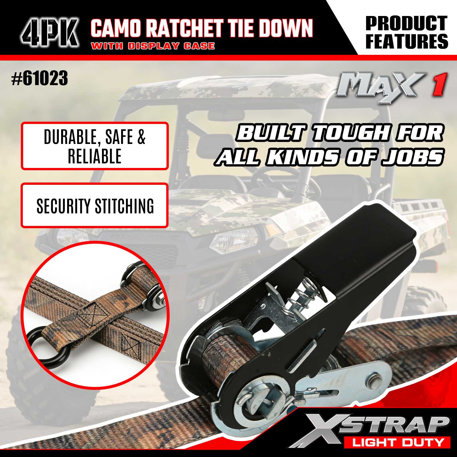 Xstrap 4PK CAMO র্যাচেট টাই ডাউন স্ট্র্যাপ হল 1 ইঞ্চি x 10 ফুট, নিরাপদ কাজের লোড হল 300lbs এবং ব্রেকিং শক্তি হল 900lbs৷