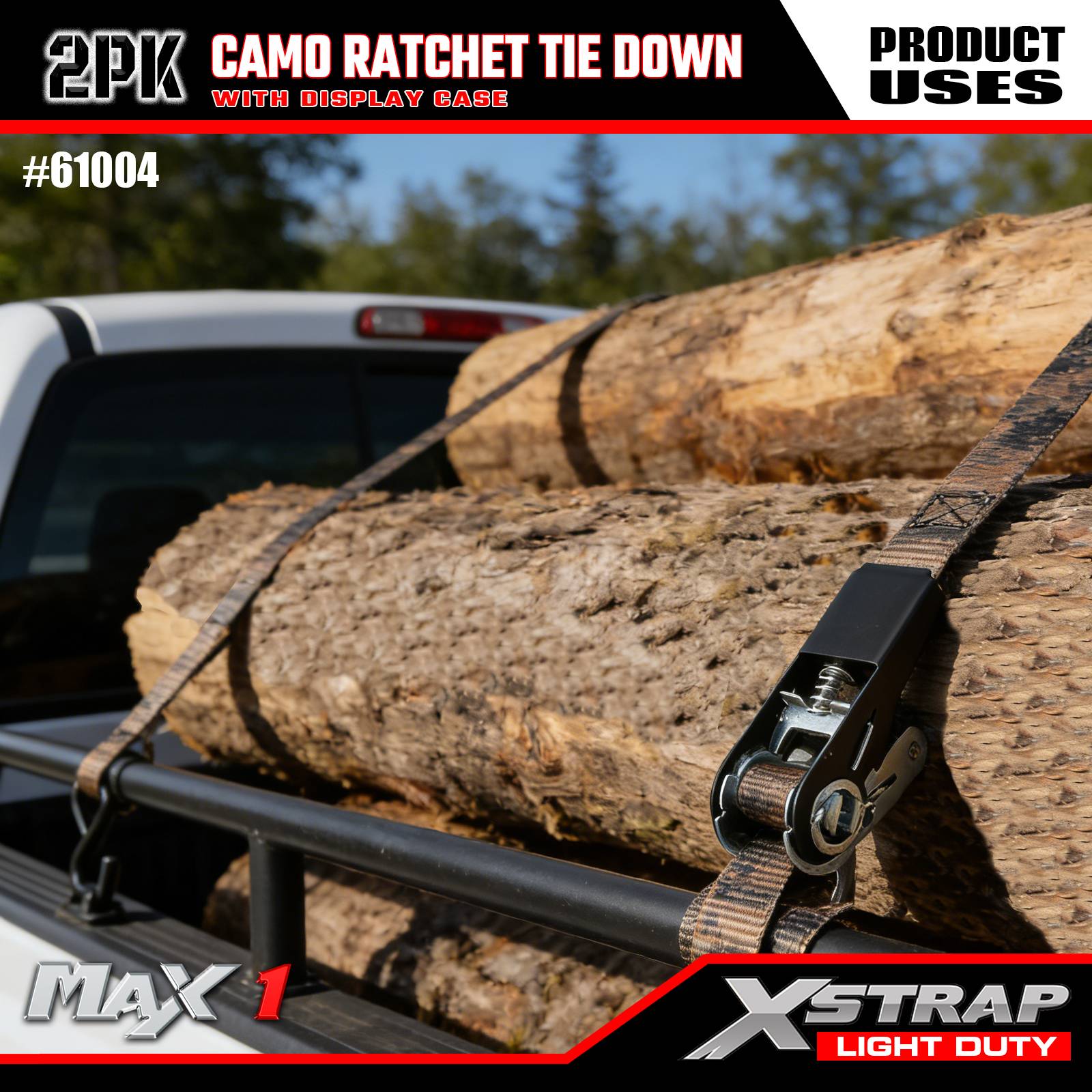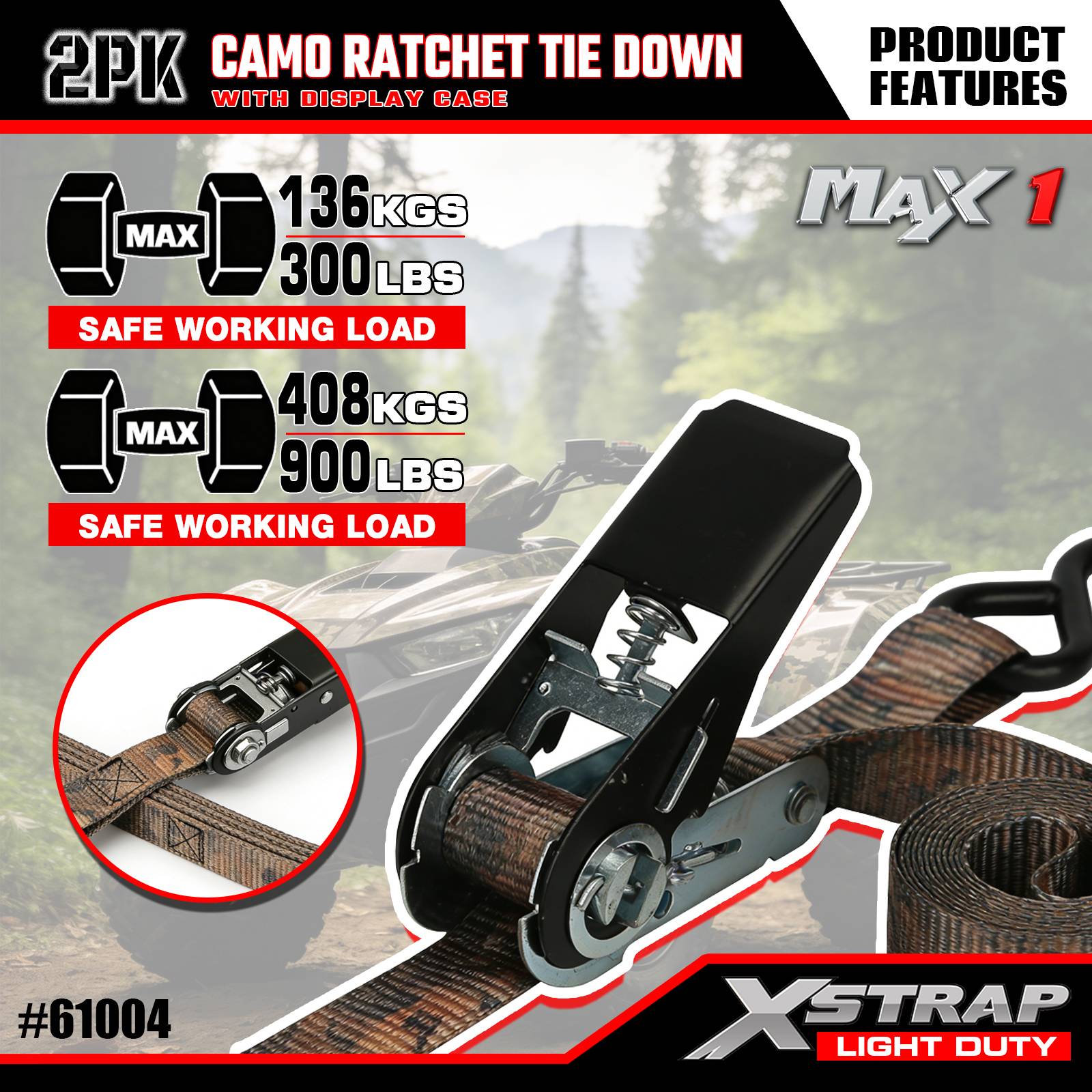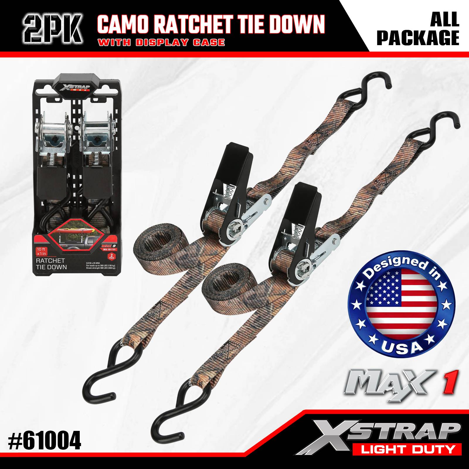 Xstrap 2 প্যাক র্যাচেট টাই-ডাউন স্ট্র্যাপস, 1"x10' - 300 পাউন্ড লোড ক্যাপ- 900 পাউন্ড ব্রেক স্ট্রেংথ-কার্গো স্ট্র্যাপস মুভিং অ্যাপ্লায়েন্স, লন ইকুইপমেন্ট, মোটরসাইকেল, ক্যামোফ্লেজ