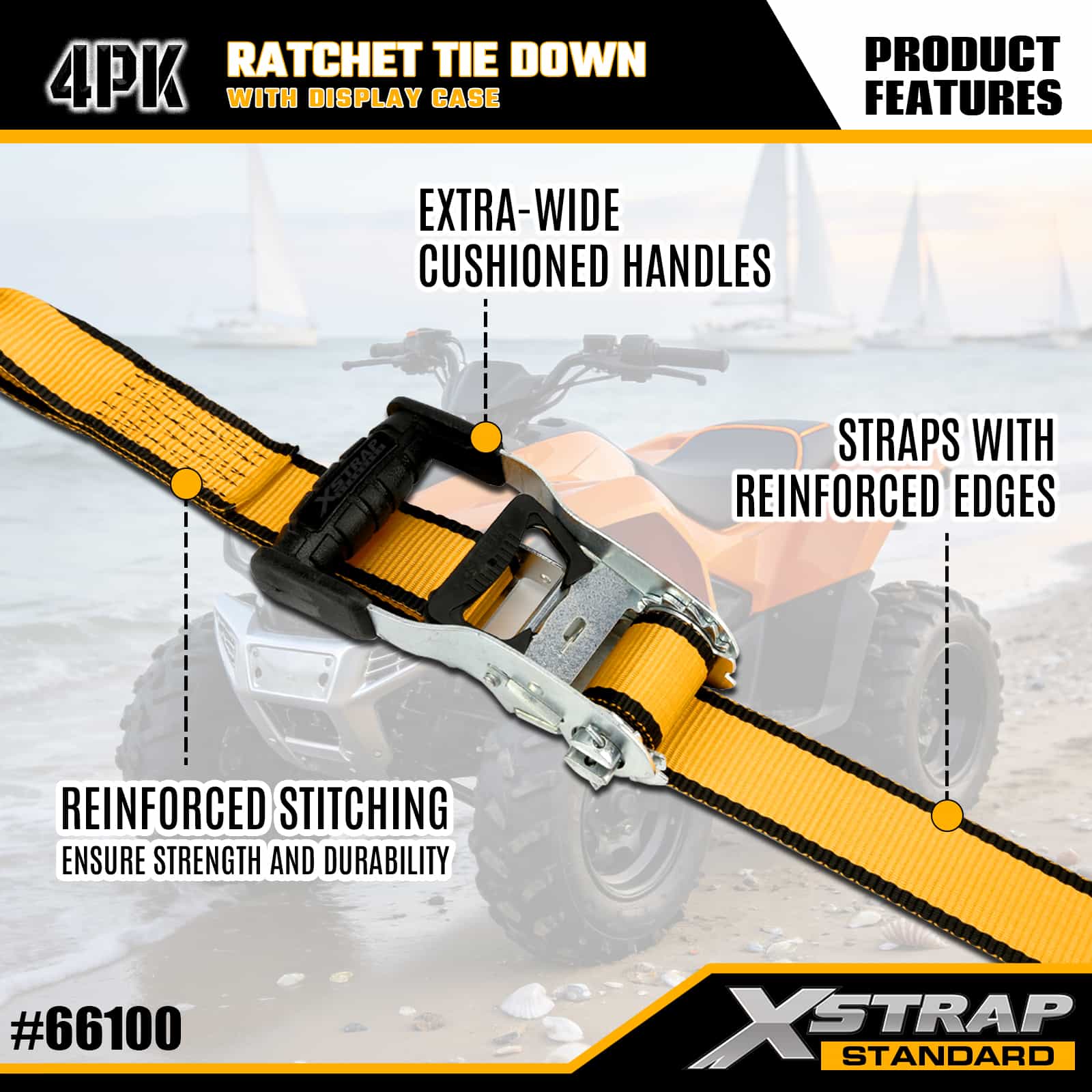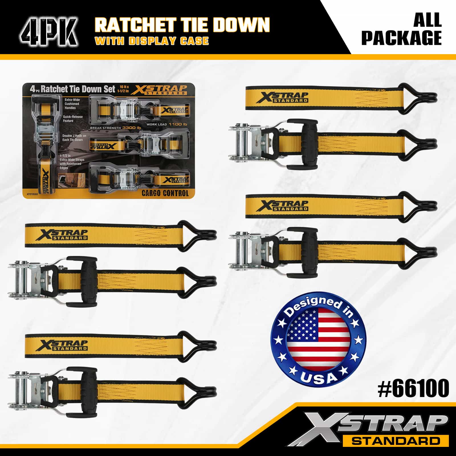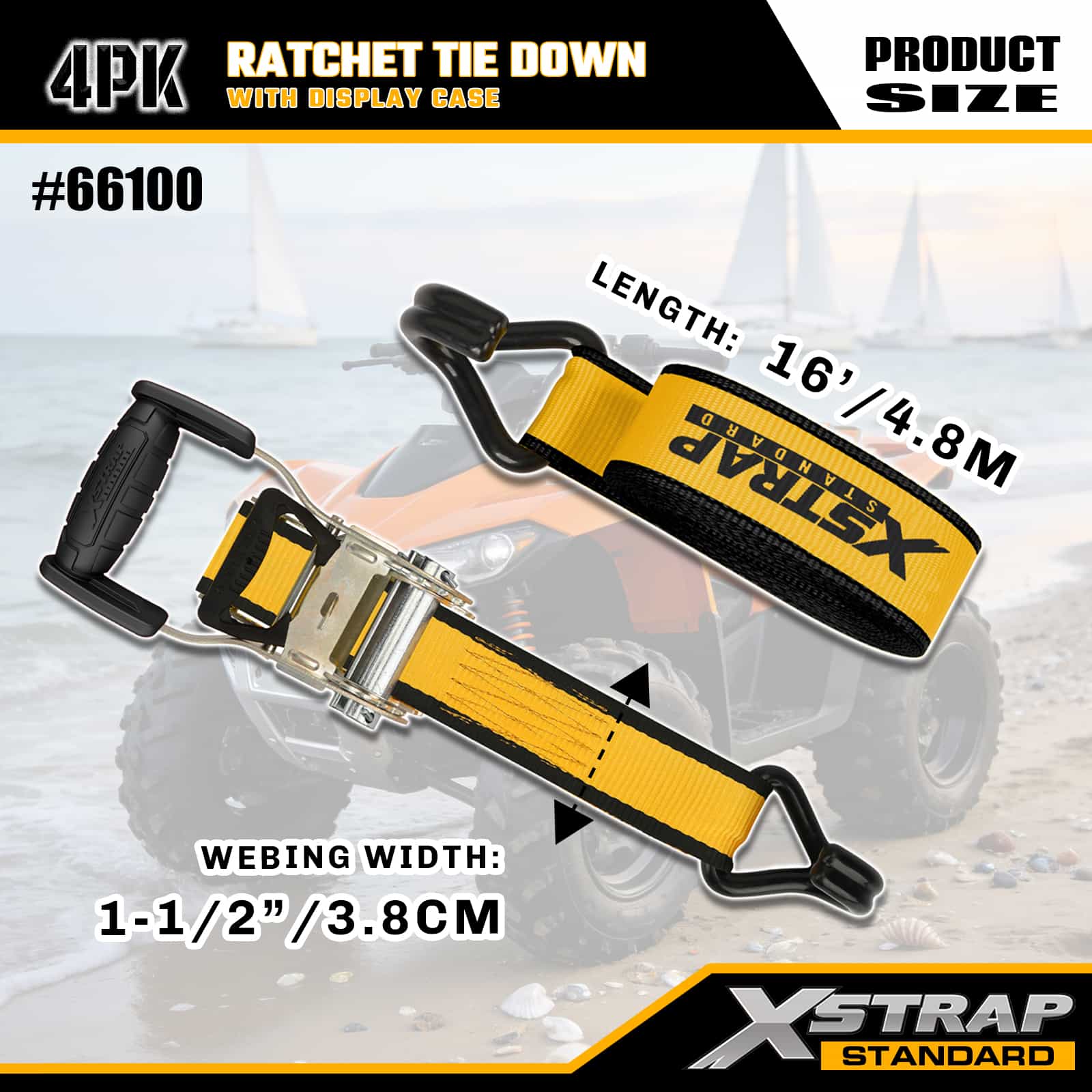 এক্সস্ট্র্যাপ 4 প্যাক র্যাচেট ডাবল জে হুকগুলির সাথে টাই ডাউন, 1-1/2" x 16’ পলিয়েস্টার টাই ডাউন স্ট্র্যাপ পুল র্যাচেট স্ট্র্যাপ, 1100lbs ক্ষমতাসম্পন্ন কার্গো ল্যাশিং সিকিউরিং স্ট্র্যাপগুলি পিকআপ ট্রাক, SUV, কার, মোটরসাইকেল, টপ জেটকি, এফ জেট র্যাকগুলির জন্য ডাবল জে হুক সহ স্নোমোবাইল, লন ট্রাক্টর।
