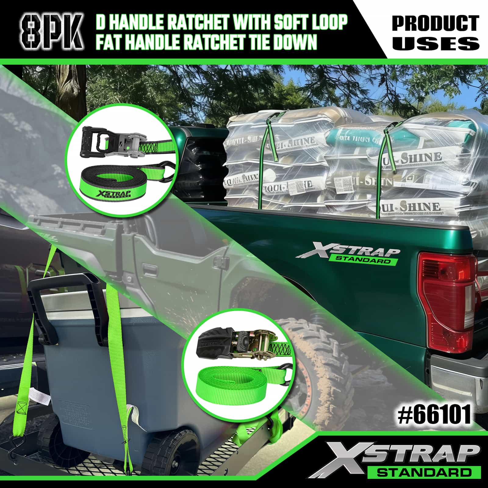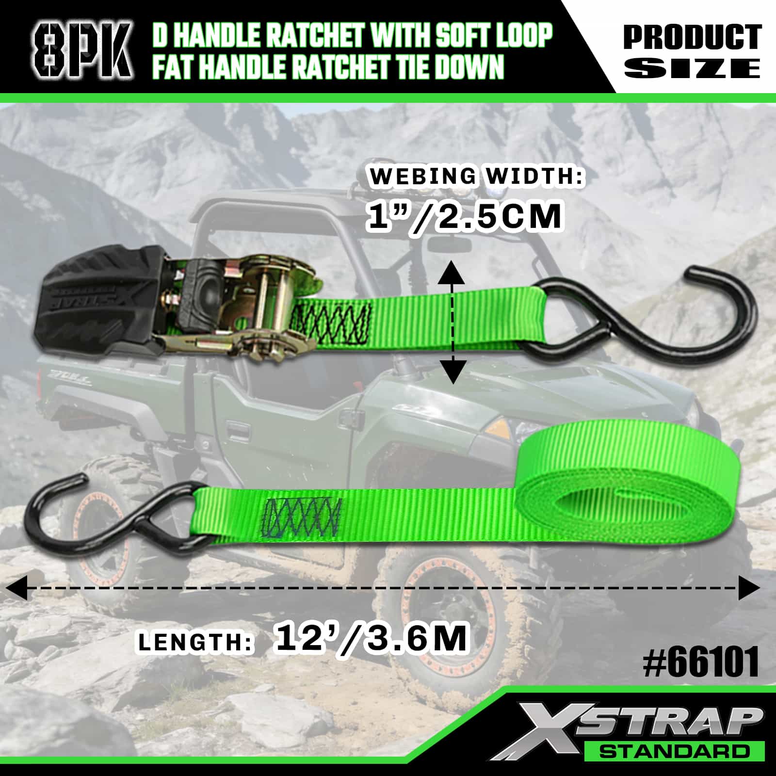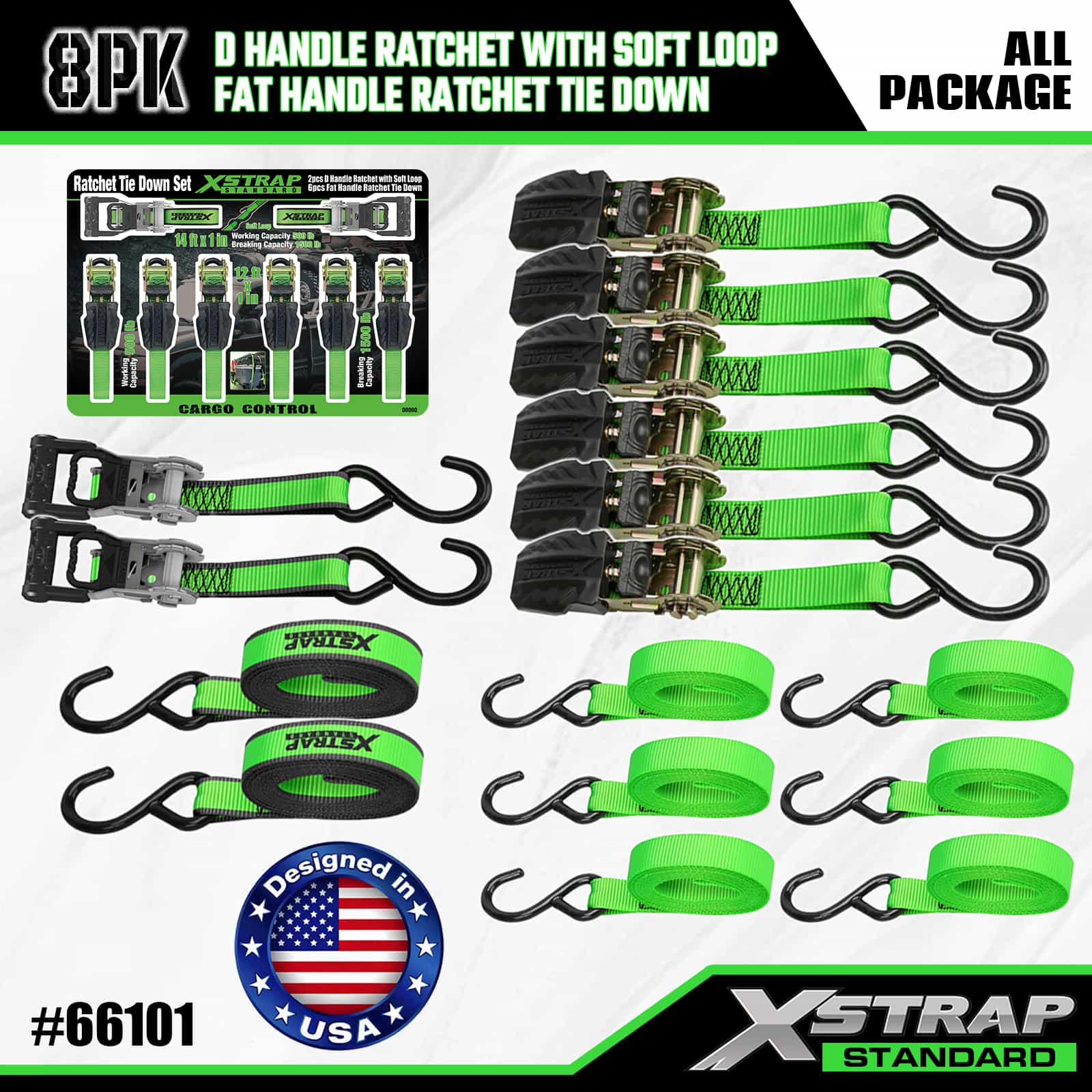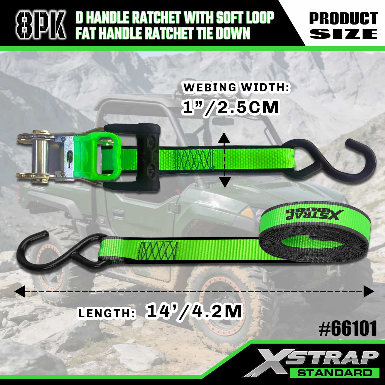 2PK 1” x 14’ D হ্যান্ডেল র্যাচেট সফট লুপ সহ এবং 6PK 1” x 12’ ফ্ল্যাট হ্যান্ডেল র্যাচেট টাই ডাউন