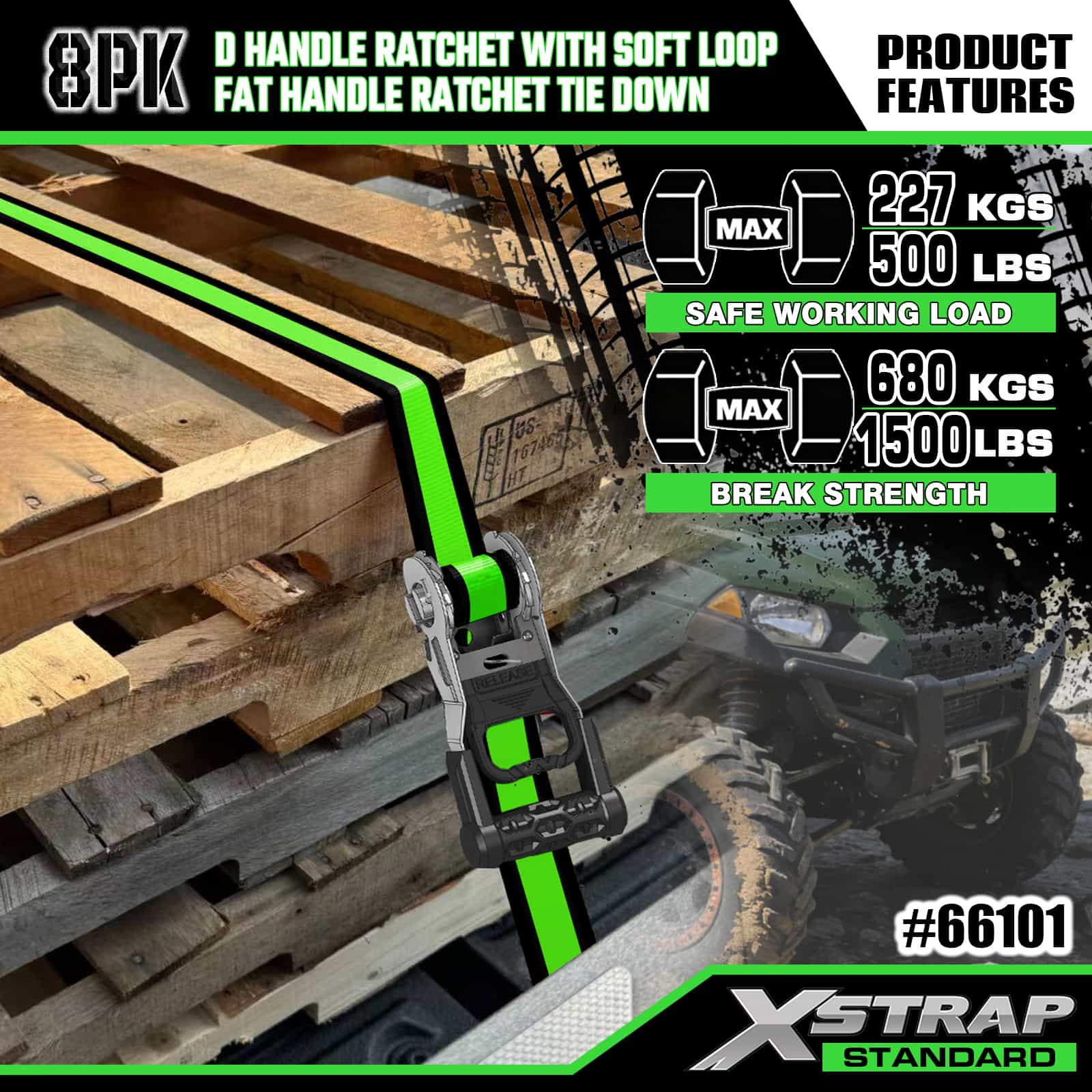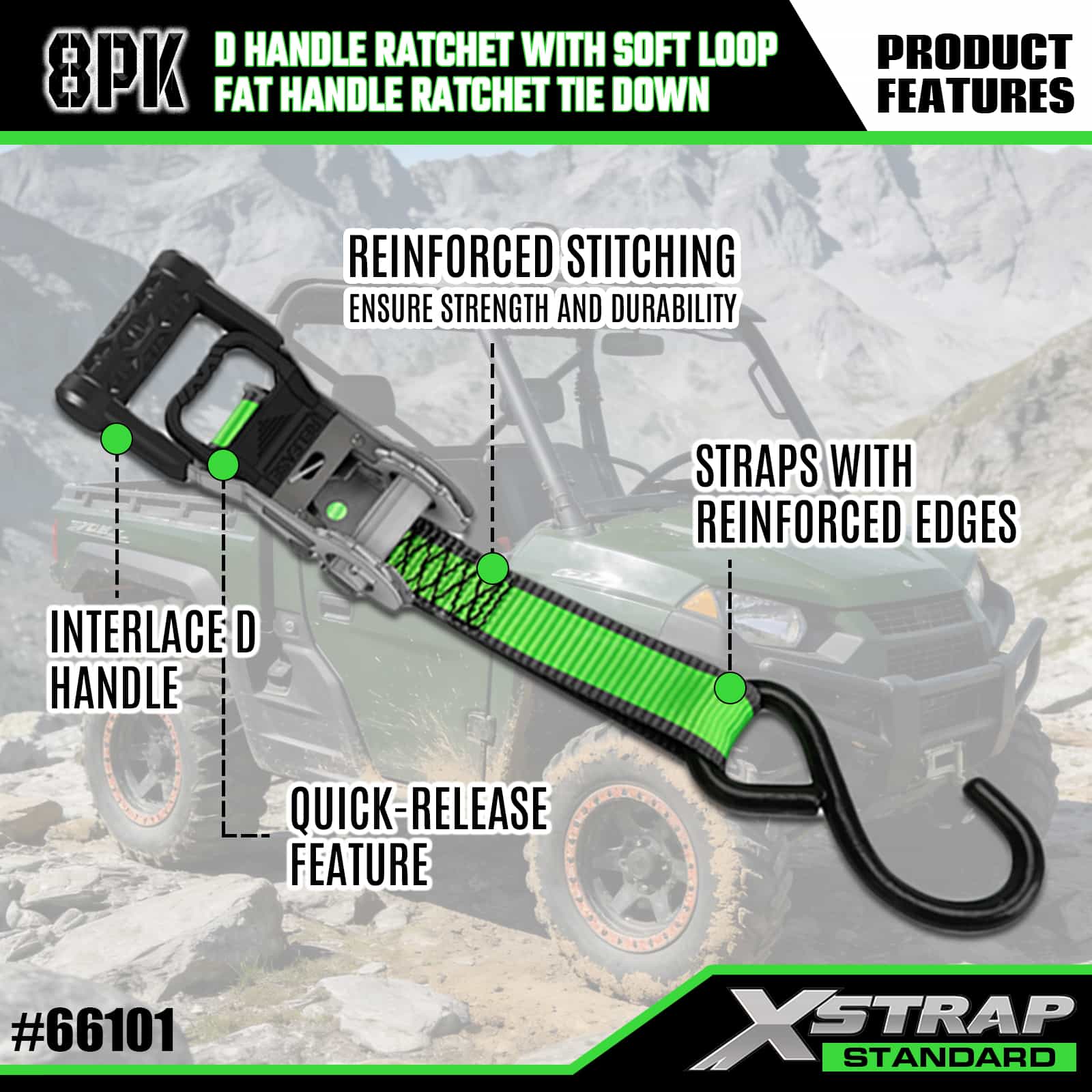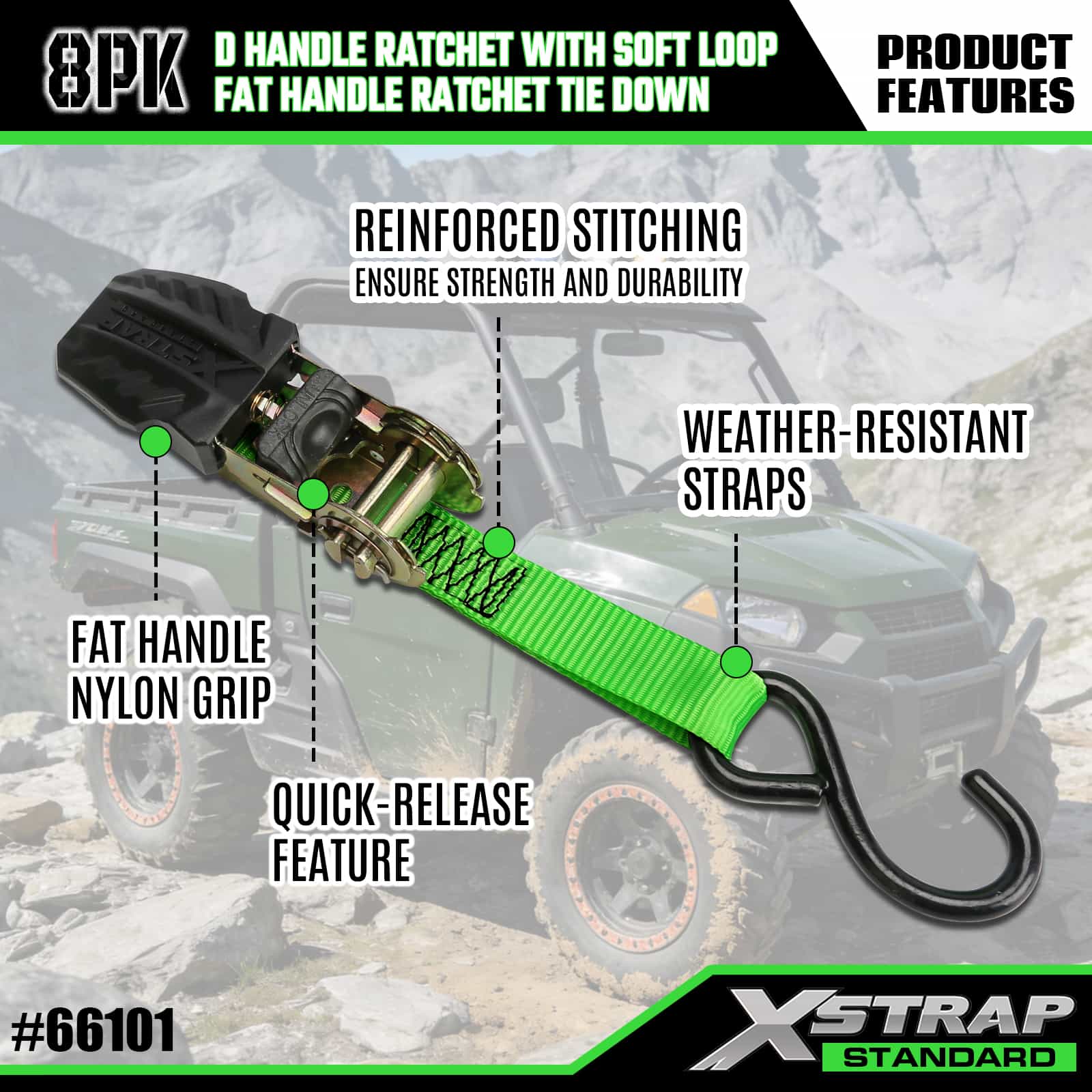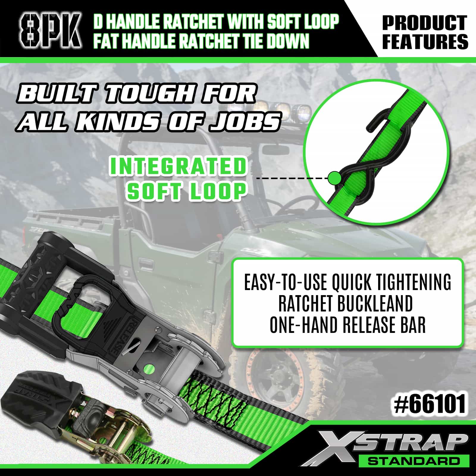2PK 1” x 14’ D হ্যান্ডেল র্যাচেট সফট লুপ সহ এবং 6PK 1” x 12’ ফ্ল্যাট হ্যান্ডেল র্যাচেট টাই ডাউন