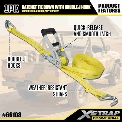 ডাবল জে হুকগুলির সাথে এক্সস্ট্র্যাপ র্যাচেট টাই ডাউন, 2” x 27’ পলিয়েস্টার টাই ডাউন স্ট্র্যাপ পুল র্যাচেট স্ট্র্যাপ, কার্গো কন্ট্রোল পিকআপ ট্রাক, মোটরসাইকেল ট্রাকের জন্য ডাবল জে হুক সহ 3333lbs ক্যাপাসিটি কার্গো ল্যাশিং সিকিউরিং স্ট্র্যাপ।