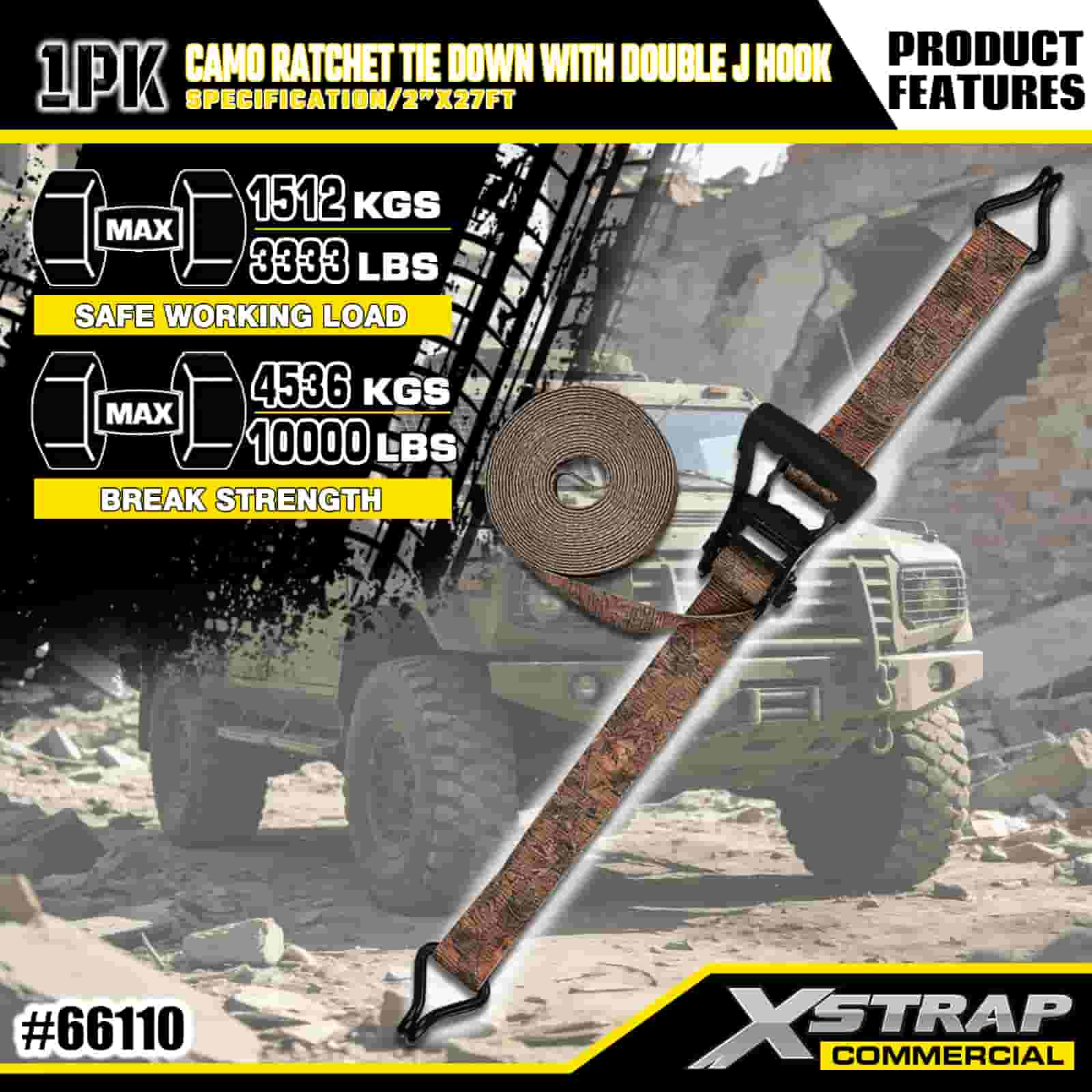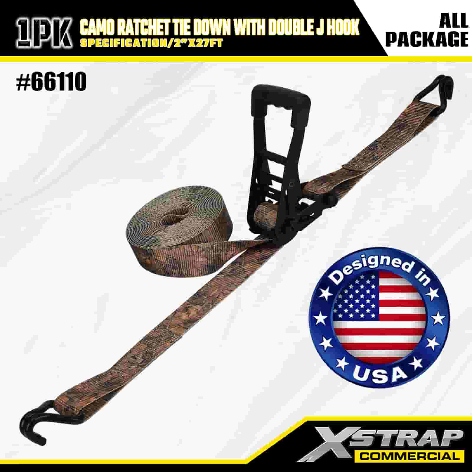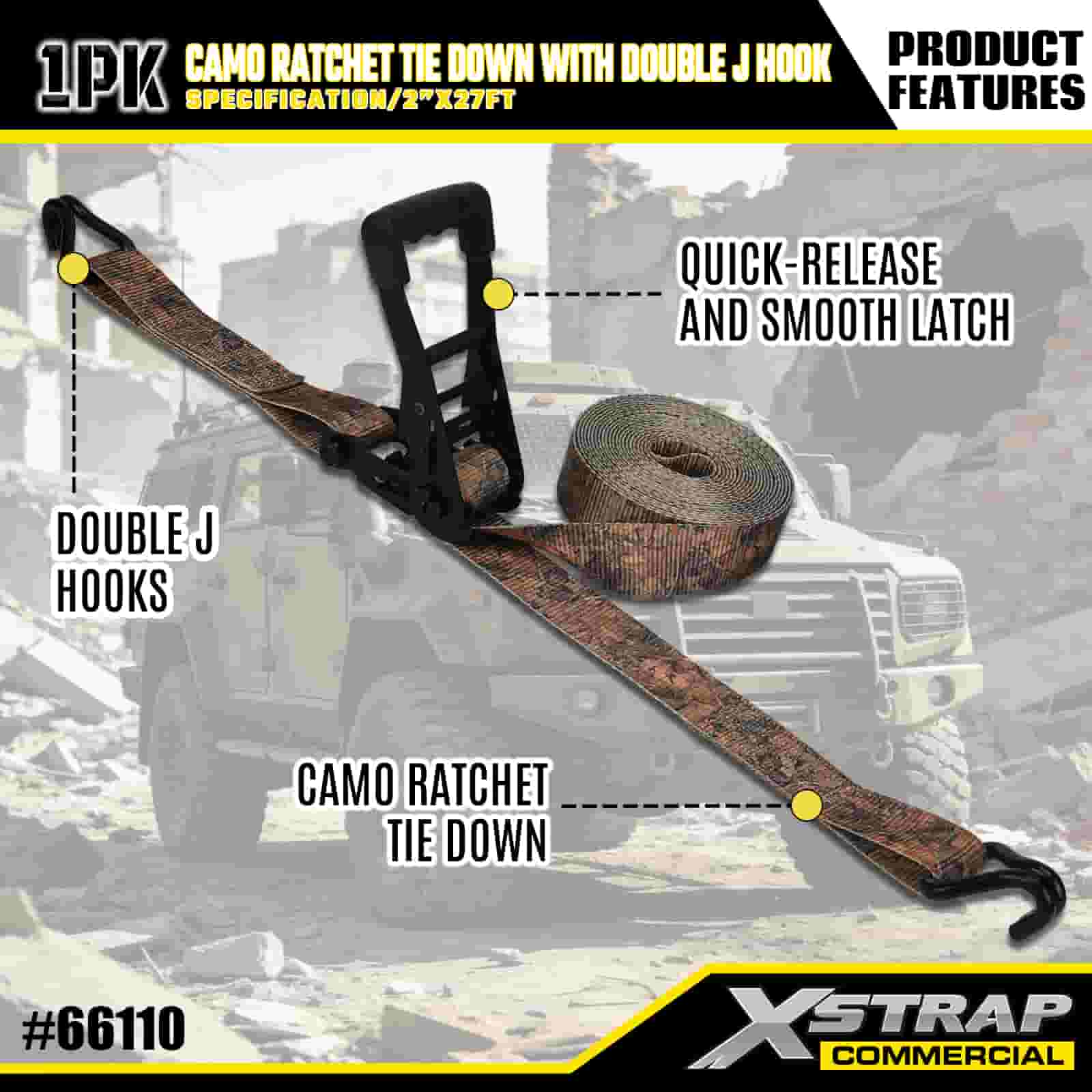 Xstrap CAMO র্যাচেট টাই ডাউন ডাবল J হুক, 2” x 27’ পলিয়েস্টার টাই ডাউন স্ট্র্যাপ পুল র্যাচেট স্ট্র্যাপ, কার্গো কন্ট্রোল পিকআপ ট্রাক, মোটরসাইকেল ট্রাক, মোটরসাইকেল ট্রাকের জন্য ডাবল জে হুক সহ 3333lbs ক্যাপাসিটি কার্গো ল্যাশিং সিকিউরিং স্ট্র্যাপ।