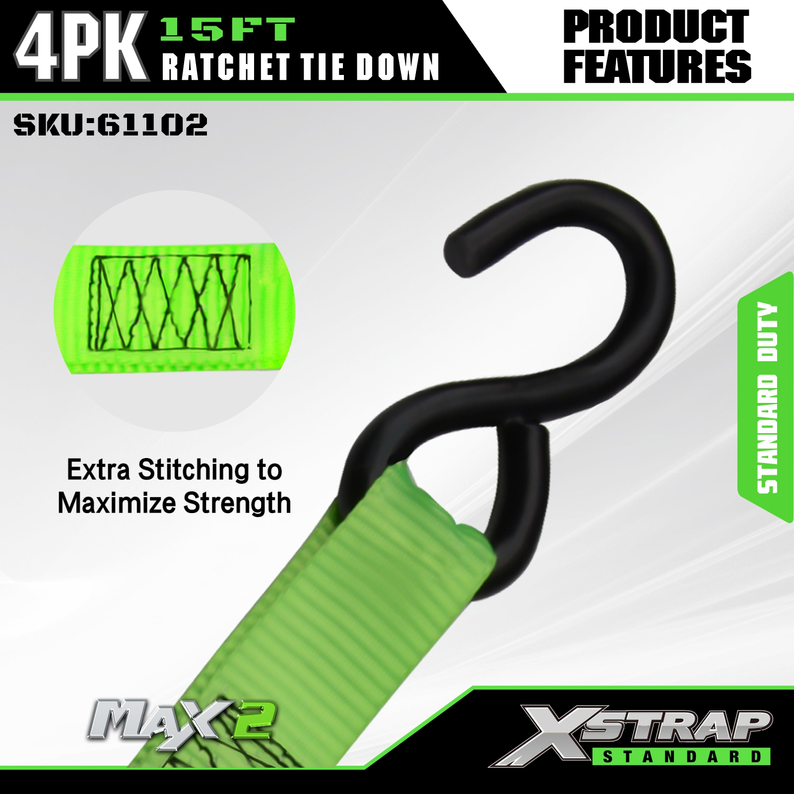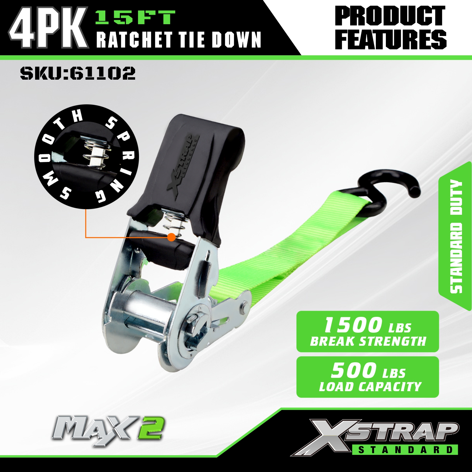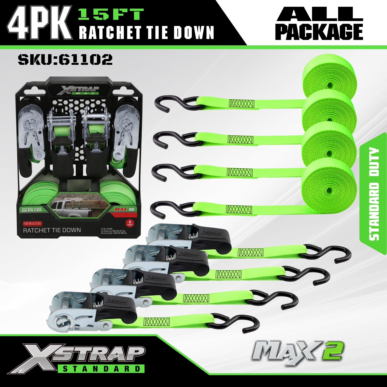 Xstrap Ratchet টাই ডাউন স্ট্র্যাপ 4 PK 15Ft- 500 Lbs লোড ক্যাপাসিটি 1500 Lbs ব্রেক স্ট্রেন্থ-কার্গো স্ট্র্যাপ সরানোর জন্য যন্ত্রপাতি, লন ইকুইপমেন্ট, মোটরসাইকেল।