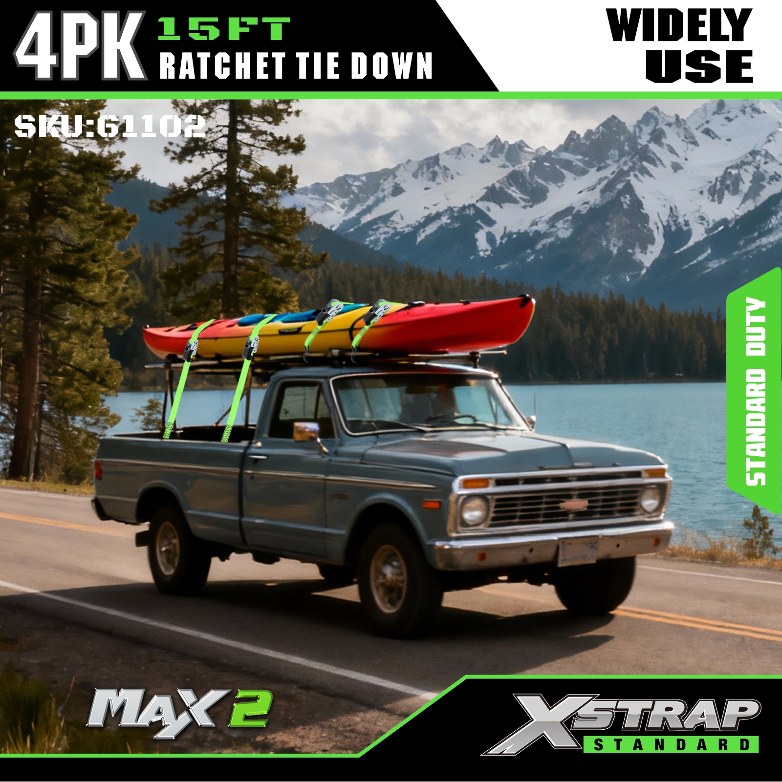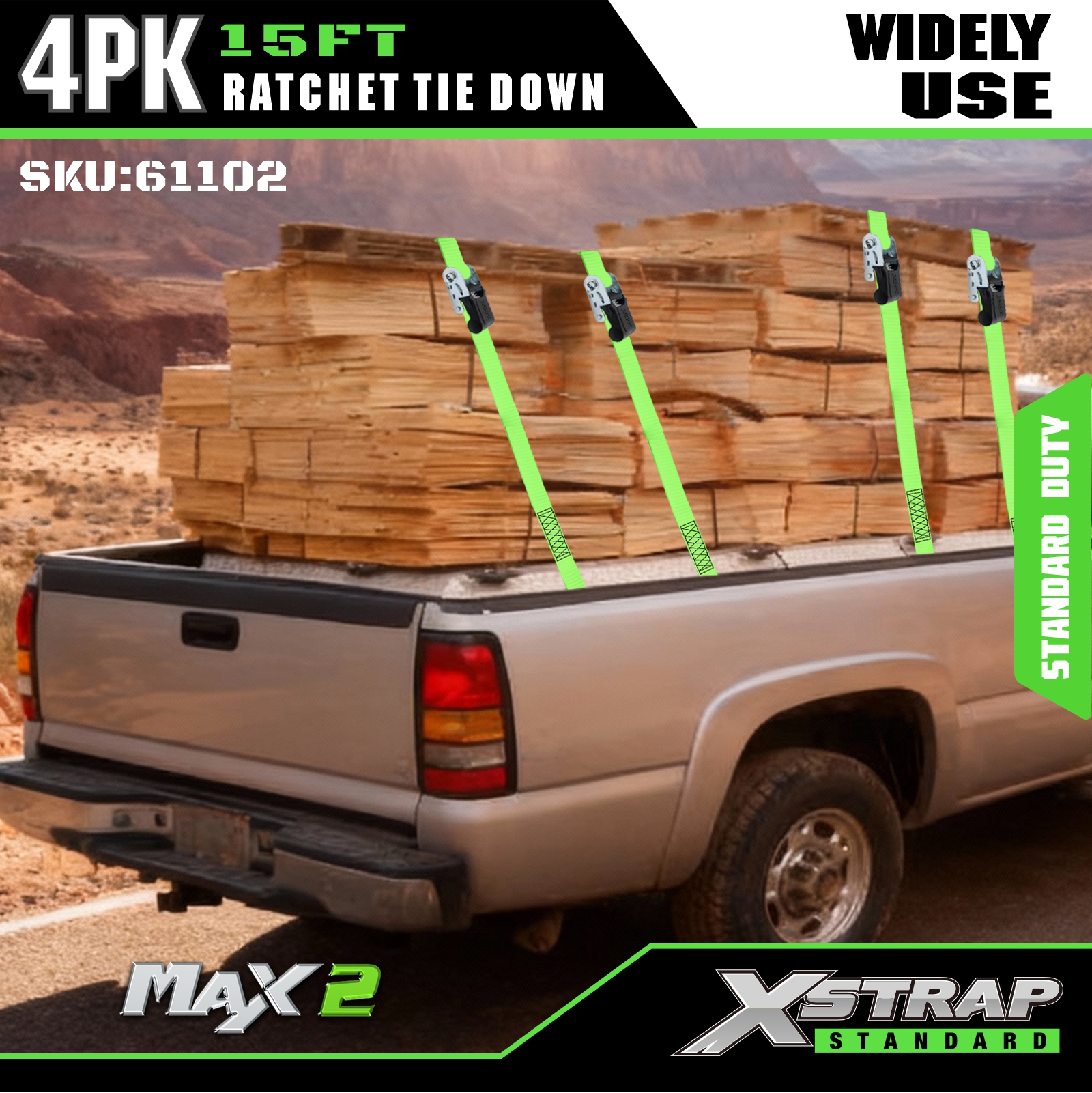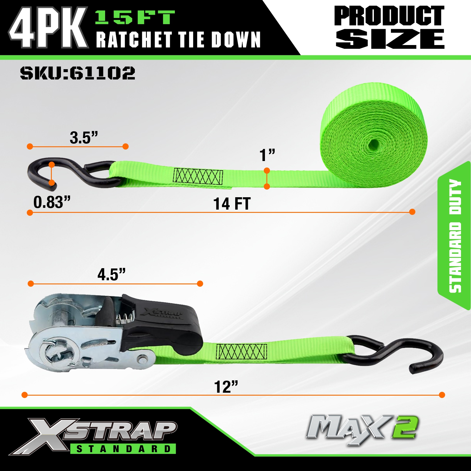 Xstrap Ratchet টাই ডাউন স্ট্র্যাপ 4 PK 15Ft- 500 Lbs লোড ক্যাপাসিটি 1500 Lbs ব্রেক স্ট্রেন্থ-কার্গো স্ট্র্যাপ সরানোর জন্য যন্ত্রপাতি, লন ইকুইপমেন্ট, মোটরসাইকেল।