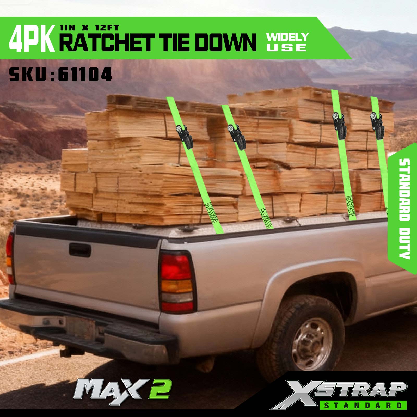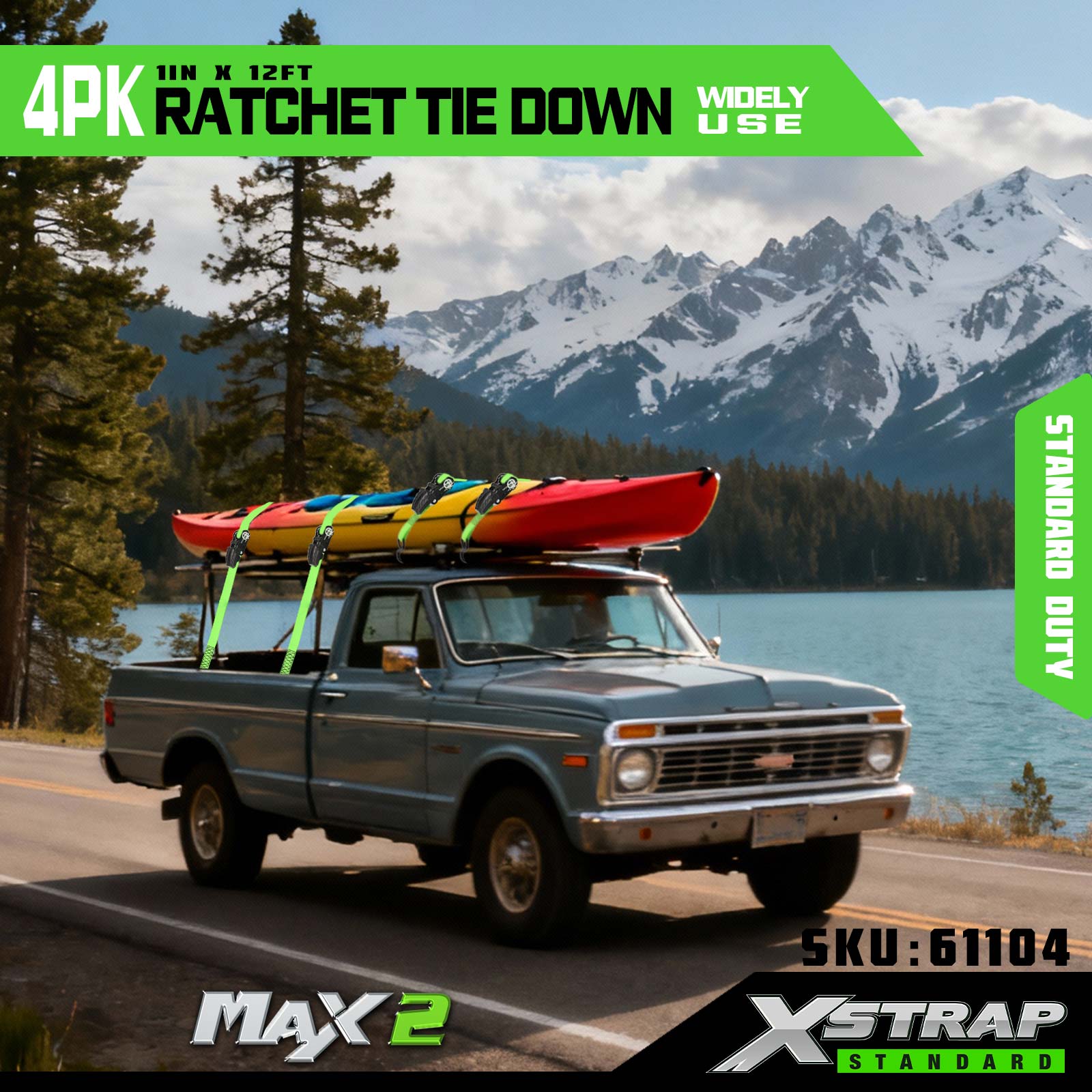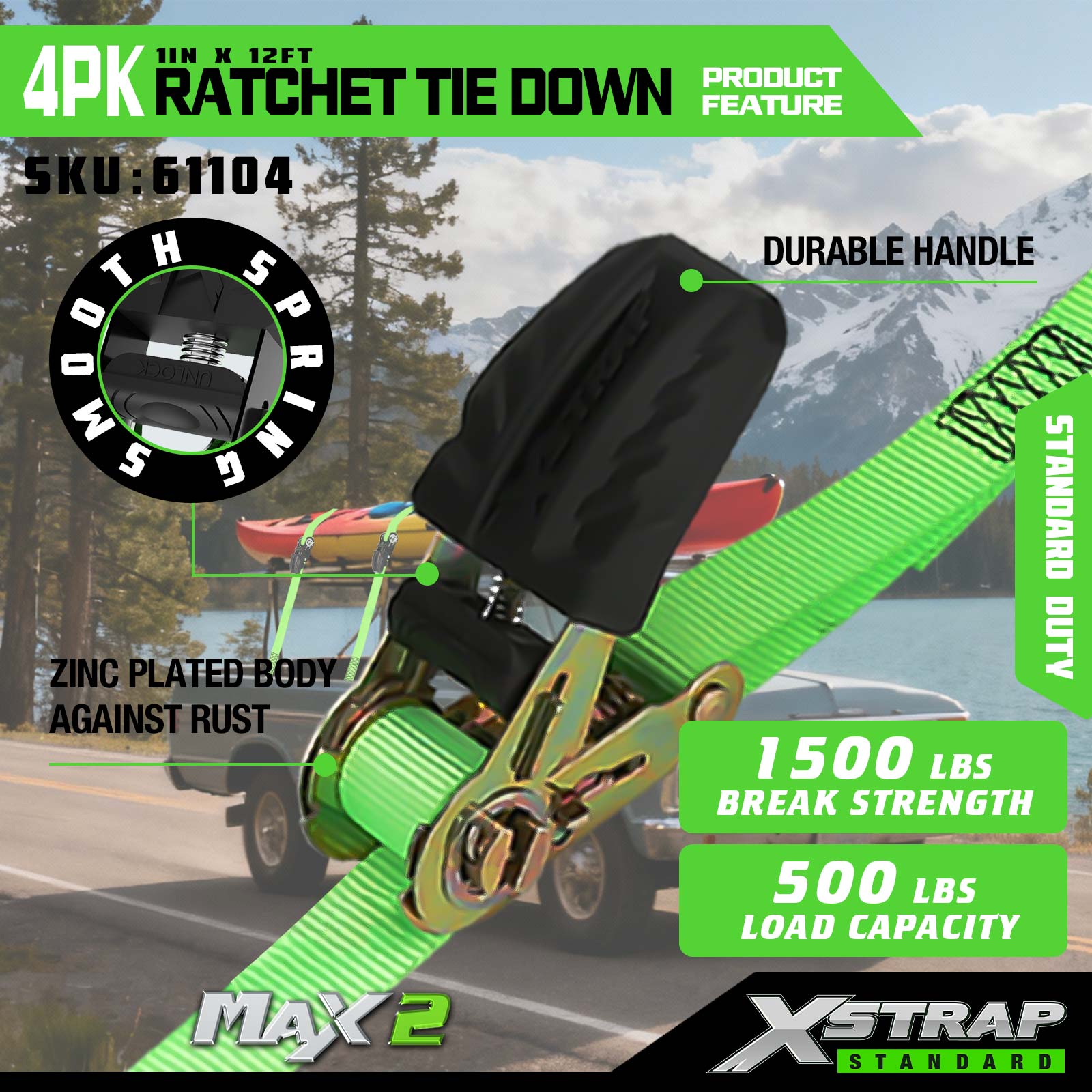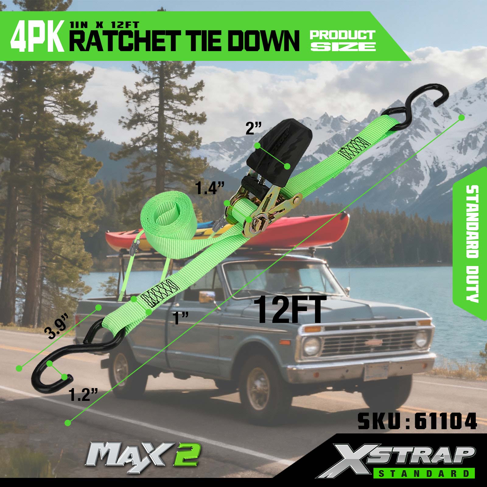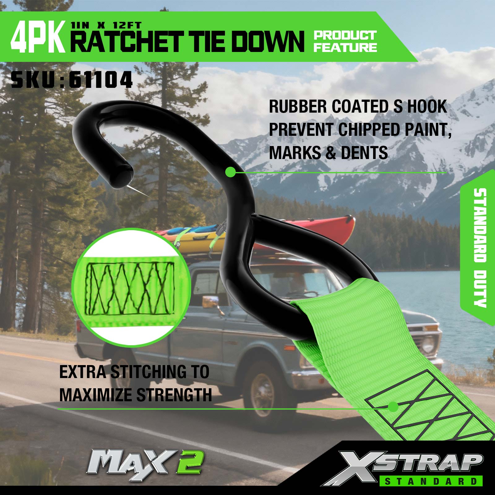 Xstrap 4 প্যাক র্যাচেট টাই ডাউন, 1” x 12’ পলিয়েস্টার টাই ডাউন স্ট্র্যাপ পুল র্যাচেট স্ট্র্যাপ, পিকআপ ট্রাকের জন্য এস হুক সহ 500lbs ক্যাপাসিটি কার্গো ল্যাশিং সিকিউরিং স্ট্র্যাপ, লাইট ডিউটি ট্রেলার মোটরসাইকেল, লাইট ফিশিং বোট, জেটমোবিল।