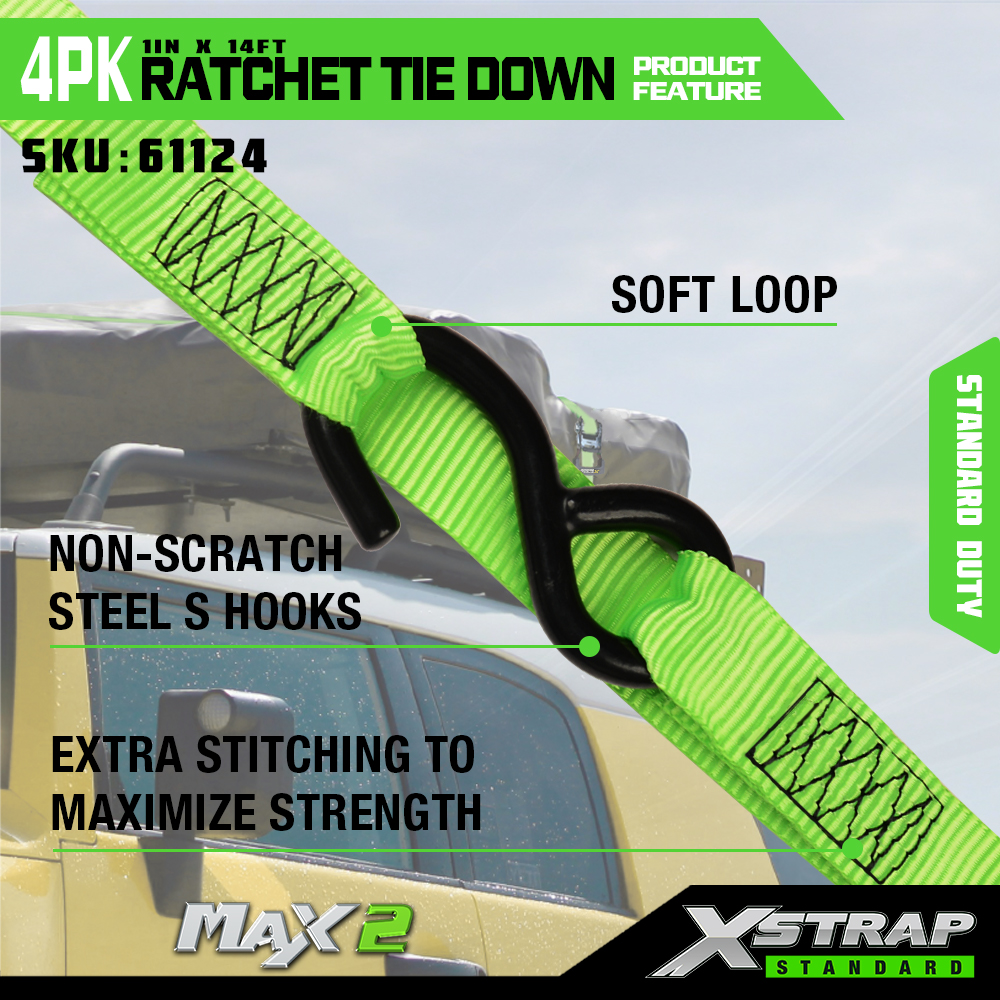 Xstrap 4 প্যাক টাই-ডাউন র্যাচেট স্ট্র্যাপস, 1"x 14' পলিয়েস্টার র্যাচেট টাই ডাউন স্ট্র্যাপ, সফট লুপ সহ, 1500lbs (500lbs) ক্যাপাসিটি কার্গো ল্যাশিং সিকিউরিং স্ট্র্যাপ মেটাল র্যাচেট এবং এস হুক দিয়ে কার্গো, ট্রাক, মাওয়ার, ATV।