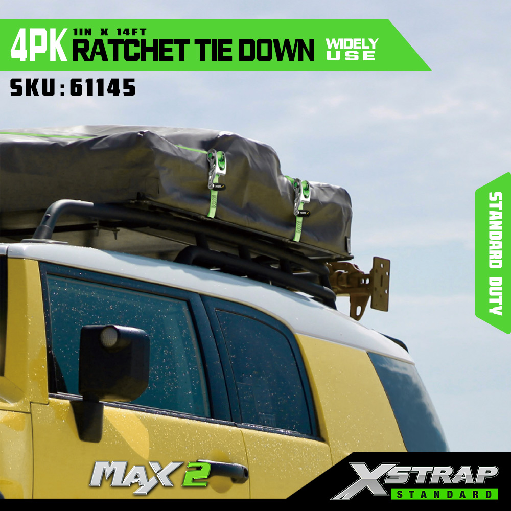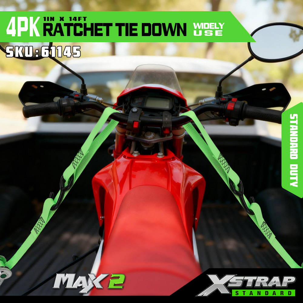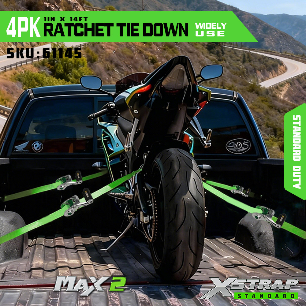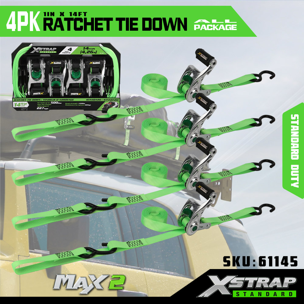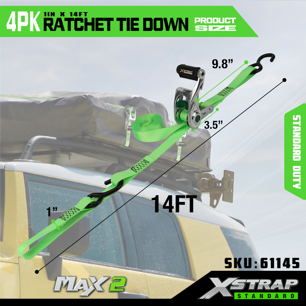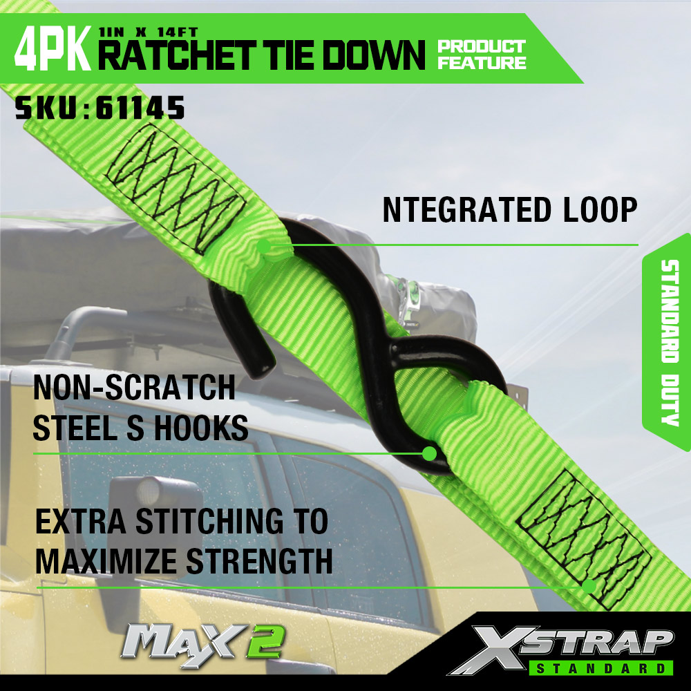 সফট লুপের সাথে Xstrap 4 প্যাক র্যাচেট টাই ডাউন, 1” x 14’ পলিয়েস্টার টাই ডাউন স্ট্র্যাপ পুল র্যাচেট স্ট্র্যাপ, ট্রাক, SUV, কার টপ র্যাক মোটরসাইকেলের জন্য S হুক সহ 1000lbs ক্ষমতার কার্গো ল্যাশিং সিকিউরিং স্ট্র্যাপ।