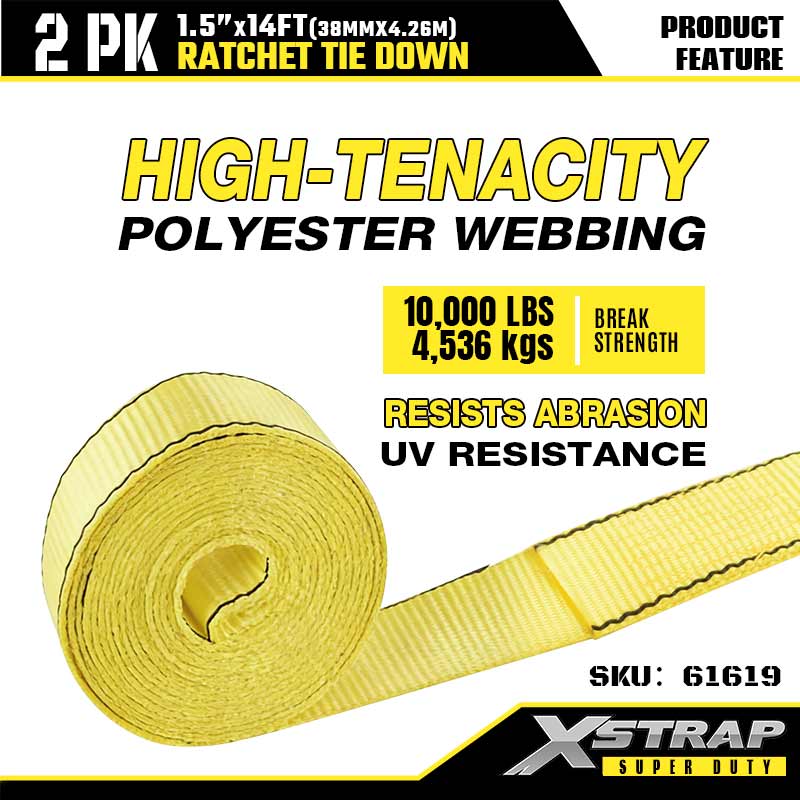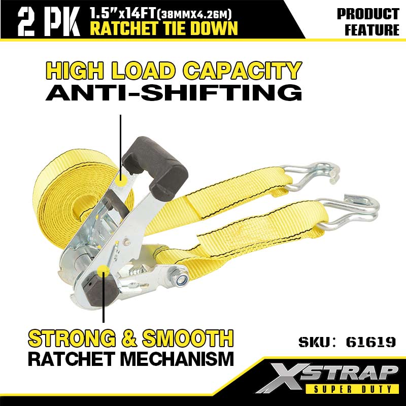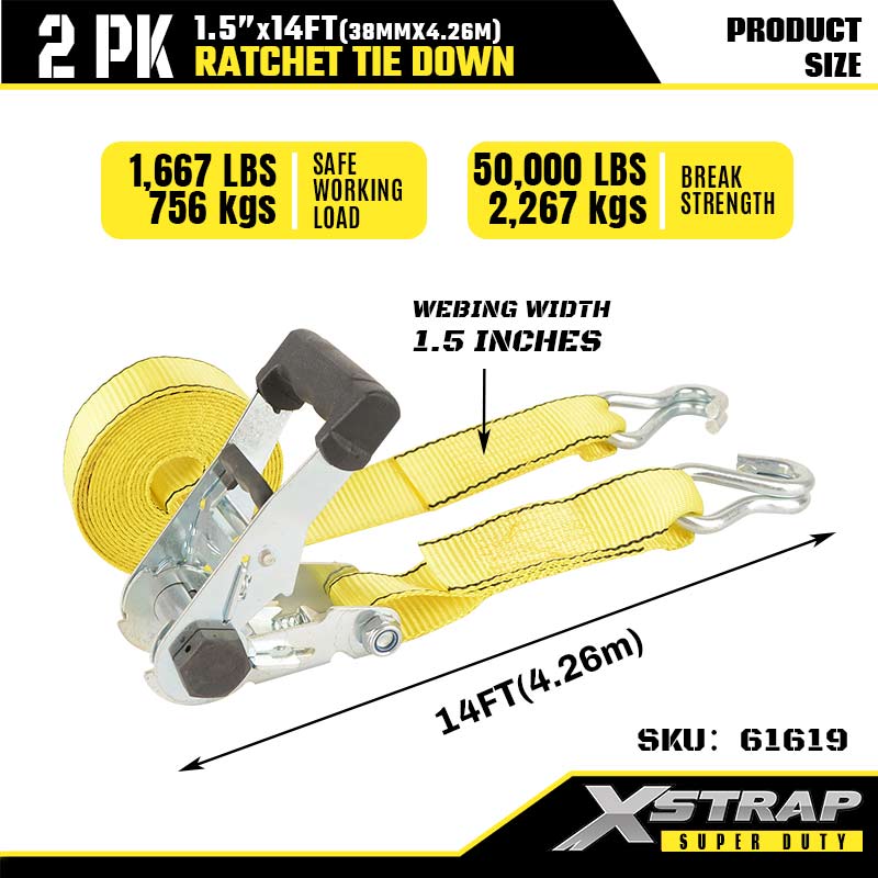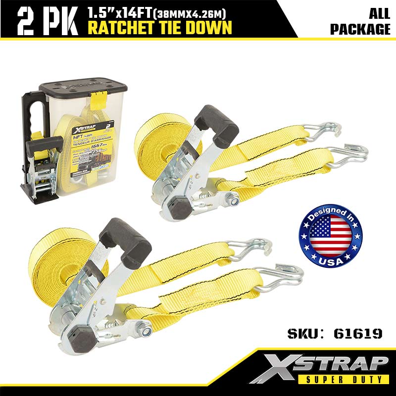 Xstrap 2PK Ratcet টাই ডাউন সঙ্গে ডাবল J হুক, 1-1/2” x 14’ পলিয়েস্টার টাই ডাউন স্ট্র্যাপ র্যাচেট স্ট্র্যাপ, 1667lbs ক্যাপাসিটি কার্গো ল্যাশিং সিকিউরিং স্ট্র্যাপ, হেভি ডিউটি ট্রেলারের জন্য ডাবল জে হুক, ফ্ল্যাট কার বোয়্যার, ফ্ল্যাট কার বোয়্যাট, ফ্ল্যাট গাড়ি।
